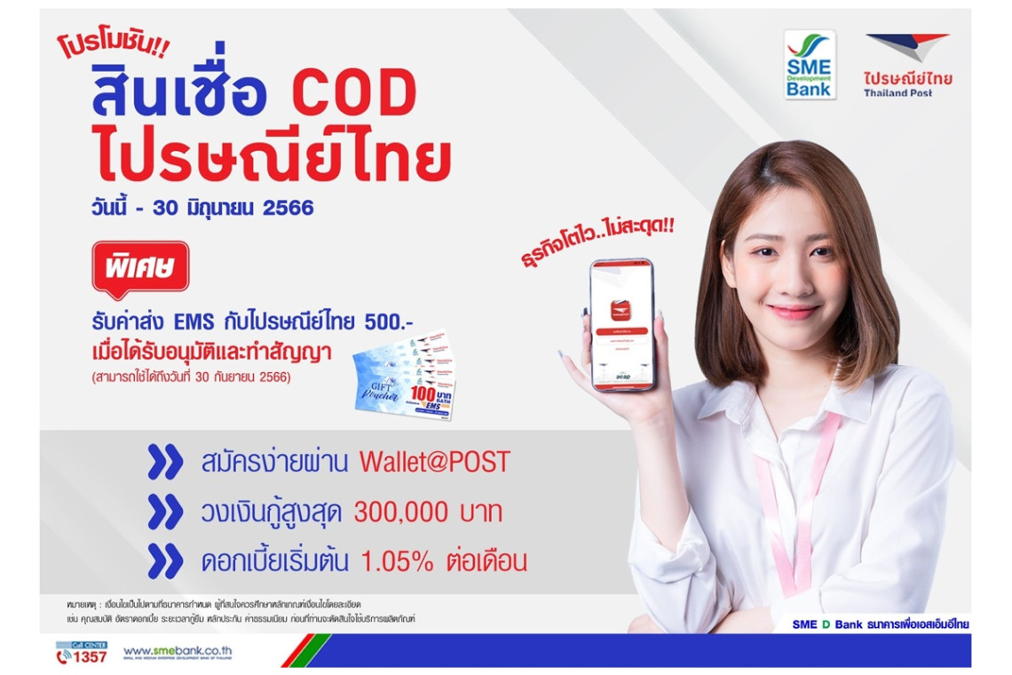 ธนาคารพัฒนาวิสาหกิจขนาดกลางและขนาดย่อมแห่งประเทศไทย (ธพว.) หรือ SME D Bank ธนาคารเพื่อเอสเอ็มอีไทย จัดโปรโมชันเอาใจผู้ประกอบการเอสเอ็มอีค้าขายออนไลน์ เมื่อยื่นกู้และได้รับอนุมัติ “สินเชื่อ COD ไปรษณีย์ไทย” ตั้งแต่วันนี้ถึง 30 มิถุนายน 2566 รับไปเลย Gift Voucher มูลค่า 500 บาท สำหรับเป็นค่าส่ง EMS กับไปรษณีย์ไทย สามารถใช้ได้จนถึงวันที่ 30 กันยายน 2566