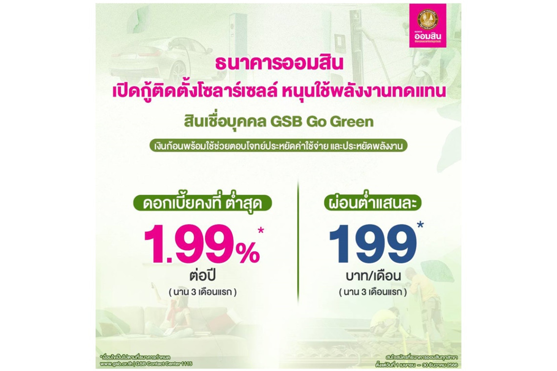 นายวิทัย รัตนากร ผู้อำนวยการธนาคารออมสิน เปิดเผยว่า จากสภาวการณ์ที่ปัญหาโลกร้อนทวีความรุนแรงก่อเกิดผลกระทบต่อผู้คนและระบบนิเวศ จึงเป็นเป้าหมายระดับโลกที่ทุกฝ่ายต้องช่วยกันผลักดันแนวคิดเรื่องการใช้พลังงานหมุนเวียนไปสู่การปฏิบัติจริง โดยส่งเสริมการใช้พลังงานที่สามารถนำกลับมาใช้ซ้ำ ปลอดภัย และเป็นมิตรต่อสิ่งแวดล้อม เพื่อช่วยลดการปล่อยก๊าซเรือนกระจกซึ่งเป็นสาเหตุสำคัญทำให้เกิดภาวะโลกร้อน ดังนั้น เพื่อสนับสนุนให้เกิดการใช้พลังงานหมุนเวียนเป็นการทดแทนดังกล่าว และยังเกิดประโยชน์ต่อระดับครัวเรือนในการช่วยลดค่าใช้จ่ายค่าไฟฟ้าได้ในระยะยาว ธนาคารออมสินจึงได้ออกผลิตภัณฑ์ล่าสุด สินเชื่อ GSB Go Green เพื่อสนับสนุนเงินทุนในการติดตั้งและซื้ออุปกรณ์สำหรับบุคคลธรรมดา ในภาวะที่ต้องเผชิญปัญหาค่าไฟฟ้าครัวเรือนเพิ่มสูงขึ้นอยู่ขณะนี้ และสินเชื่อ GSB for BCG Economy เพื่อสนับสนุนผู้ประกอบการในการลงทุนด้านพลังงานทดแทน ทั้งนี้ ผู้สนใจสามารถติดต่อขอใช้บริการสินเชื่อได้ที่ธนาคารออมสินทุกสาขาทั่วประเทศ ตั้งแต่บัดนี้เป็นต้นไป