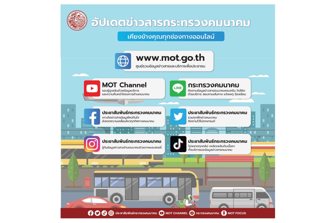 กระทรวงคมนาคม เพิ่มความสะดวกให้ประชาชนได้ติดตามข้อมูลข่าวสารงานคมนาคมที่สำคัญ รวมถึงเรื่องราวอัปเดตที่น่าสนใจด้านคมนาคม ชวนให้ติดตามช่องทางสื่อสารออนไลน์ใน 7 ช่องทางดังนี้