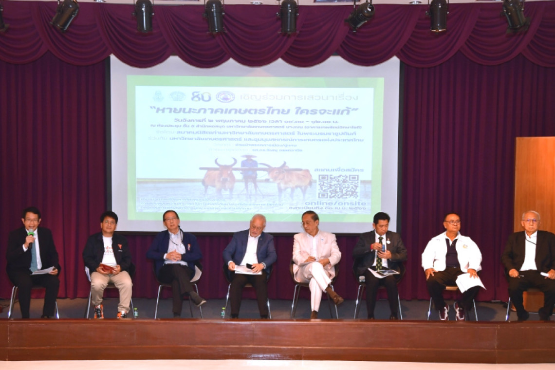 สมาคมนิสิตเก่ามหาวิทยาลัยเกษตรศาสตร์ ในพระบรมราชูปถัมภ์ (ส.มก.) ร่วมกับมหาวิทยาลัยเกษตรศาสตร์ สถาบันวิจัยและพัฒนาแห่งมหาวิทยาลัยเกษตรศาสตร์ และ ชุมนุมสหกรณ์การเกษตรแห่งประเทศไทย จัดการเสวนาทางวิชาการ เรื่อง “หายนะภาคเกษตรไทย ใครจะแก้” โดยมีวัตถุประสงค์ เพื่อเปิดโอกาสให้พรรคการเมืองได้นำเสนอนโยบายในการแก้ปัญหาหลักของการเกษตรไทย ได้แก่ ปัญหาหนี้สินเกษตรกร ปัญหาผลกระทบจากภาวะโลกร้อน และปัญหาการผูกขาด และรับฟังเสียงสะท้อน จากนักวิชาการ และประชาชน เพื่อนำไปสู่การแก้ไขที่ตรงจุด โอกาสนี้ นายสุวิศว์ เมฆเสรีกุล นายกสมาคมนิสิตเก่า ส.มก. ให้เกียรติเป็นประธานเปิดงาน ดร.ดำรงค์ ศรีพระราม รองอธิการบดีฝ่ายบริหาร กล่าวต้อนรับ เมื่อวันที่ 2 พฤษภาคม 2566 ณ ห้องประชุมชั้น 5 สำนักงานหอสมุดมหาวิทยาลัยเกษตรศาสตร์ (อาคารเทพรัตน์วิทยาโชติ)