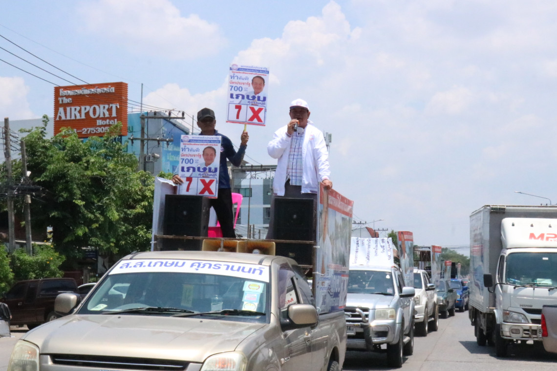 วันที่ 6 พฤษภาคม 2566 เวลา 13.00 น.นายเกษม ศุภรานนท์ ผู้สมัคร ส.ส. เขต 1 พื้นที่ ต.ในเมือง ต.หนองไผ่ล้อม และ ต.โพธิ์กลาง อ.เมือง จ.นครราชสีมา หมายเลข 7 พรรคพลังประชารัฐ (พปชร.) ขึ้นท้ายรถกระบะติดเครื่องขยายเสียงจัดขบวนแห่หาเสียงท่ามกลางอากาศร้อนอบอ้าวไปตามถนนในตัวเมือง เพื่ออ้อนขอคะแนนคนเมือง ชู “โคราชต้องพัฒนาอย่างก้าวกระโดด”