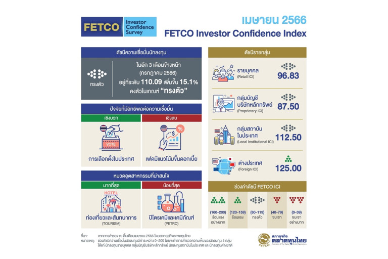นายกอบศักดิ์ ภูตระกูล ประธานกรรมการสภาธุรกิจตลาดทุนไทย แถลงดัชนีความเชื่อมั่นนักลงทุน (FETCO Investor Confidence Index) ผลสำรวจในเดือน เม.ย.66 พบว่า ดัชนีในอีก 3 เดือนข้างหน้าอยู่ที่ระดับ 110.09 เพิ่มขึ้น 15.1% จากเดือนก่อนหน้า โดยยังอยู่ในเกณฑ์ "ทรงตัว" นักลงทุนมองว่าการเลือกตั้งในประเทศจะเป็นปัจจัยหนุนความเชื่อมั่นมากที่สุด รองลงมาคือความคาดหวังต่อการไหลเข้าของเงินทุน และการฟื้นตัวของภาคท่องเที่ยว สำหรับปัจจัยที่ฉุดความเชื่อมั่นนักลงทุนมากที่สุด ได้แก่ แนวโน้มการขึ้นดอกเบี้ยนโยบายของธนาคารกลางสหรัฐฯ (เฟด) รองลงมาคือสถานการณ์การเมืองในประเทศในช่วงเลือกตั้ง และสถานการณ์เงินเฟ้อ