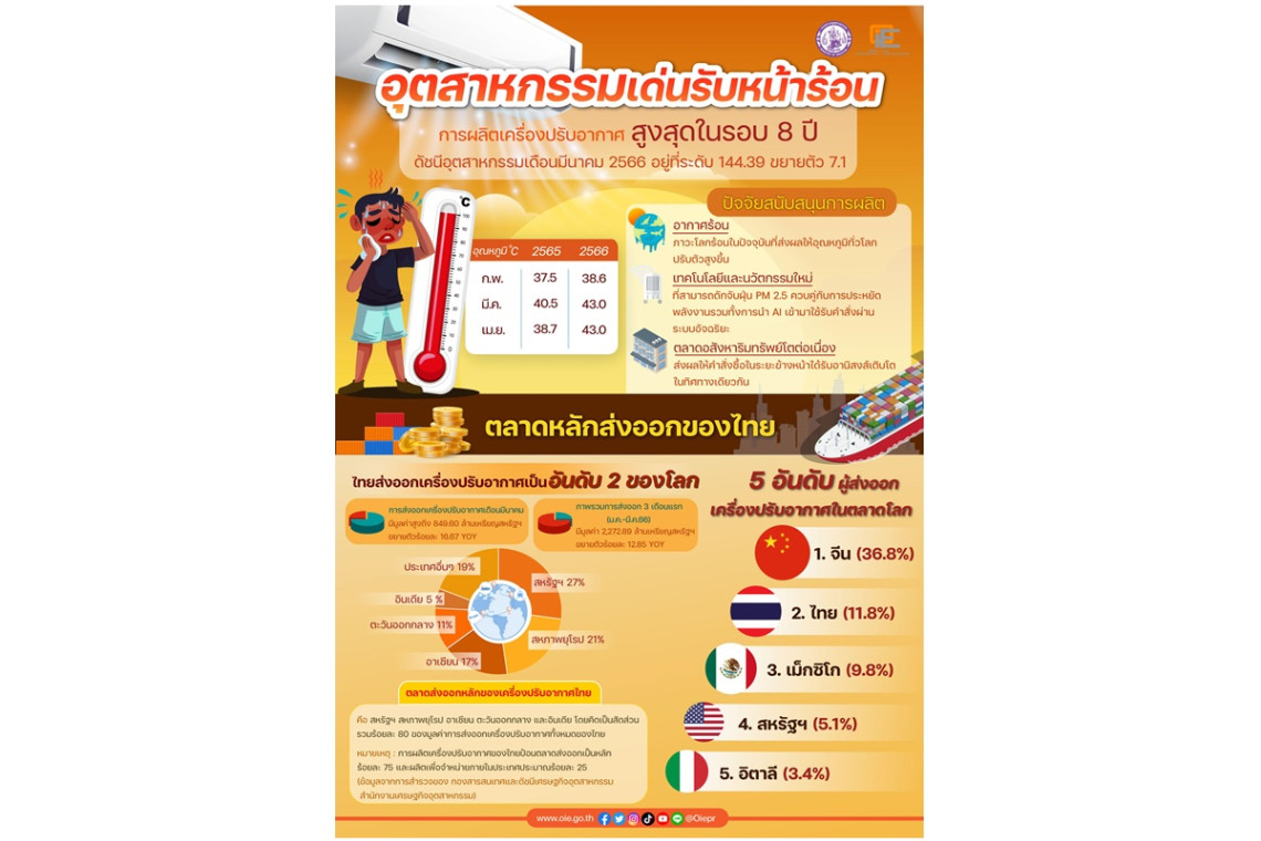 นางวรวรรณ ชิตอรุณ ผู้อำนวยการสำนักงานเศรษฐกิจอุตสาหกรรม (สศอ.) เปิดเผยว่า ฤดูร้อนในปี 2566 ส่งผลให้อุตสาหกรรมเครื่องปรับอากาศได้รับอานิสงส์ขยายตัวโดดเด่น จากสภาพอากาศที่ร้อนจัดและสถานการณ์ฝุ่น PM 2.5 ที่ปรับสูงขึ้นในช่วง 2-3 เดือนที่ผ่านมา โดยในเดือนมีนาคม 2566 ดัชนีผลผลิตอุตสาหกรรม (MPI) ของอุตสาหกรรมเครื่องปรับอากาศ อยู่ที่ระดับ 144.39 ขยายตัวที่ร้อยละ 7.1 จากช่วงเดียวกันของปีก่อน ซึ่งเป็นการผลิตเครื่องปรับอากาศสูงสุดในรอบ 8 ปี ส่งผลให้ประเทศไทยขยับขึ้นเป็นผู้ส่งออกเครื่องปรับอากาศอันดับ 2 ของโลก รองจากประเทศจีน คาดการณ์คำสั่งซื้อในระยะข้างหน้ายังคงได้รับอานิสงส์อย่างต่อเนื่อง