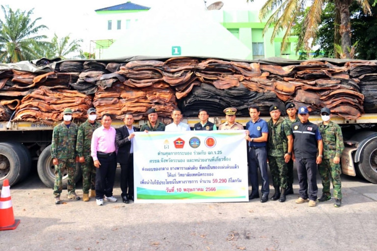 วันที่ 11 พ.ค.66 พันเอกภูมิพัฒน์ บุญเรืองขาว ผู้บังคับหน่วยเฉพาะกิจกรมทหารราบที่ 25 ร่วมกับ นายบุญมี บูรณะภักดี นายด่านศุลกากรระนอง และส่วนราชการที่เกี่ยวข้อง ส่งมอบยางพาราเเผ่นที่ลักลอบนำเข้าจากประเทศเมียนมาหลังจากที่หน่วยจับกุม จนดำเนินคดีสิ้นสุดเเล้ว งวดเเรก จำนวน 33 คดี น้ำหนักรวม 60,000 กิโลกรัม ให้แก่ วิทยาลัยเทคนิคระยอง โดยนายชรินทร์ ชูชื่น รองผู้อำนวยการวิทยาลัยเทคนิคระยอง เป็นผู้รับมอบยางพาราดังกล่าว เพื่อนำไปใช้ประโยชน์เป็นวัสดุการเรียนการสอนด้านเทคโนโลยีการยาง และพอลิเมอร์ ในการพัฒนาต่อยอดผลิตภัณฑ์และของใช้จากยางพารา รวมทั้งงานวิจัย ให้แก่นักศึกษาวิทยาลัยเทคนิคระยอง โดยมี นายสมใจ บุญชัย รองผู้ว่าราชการจังหวัดระนอง ร่วมเป็นสักขีพยานในการส่งมอบครั้งนี้ ณ ด่านศุลกากรระนอง ต.ปากน้ำ อ.เมือง จ.ระนอง