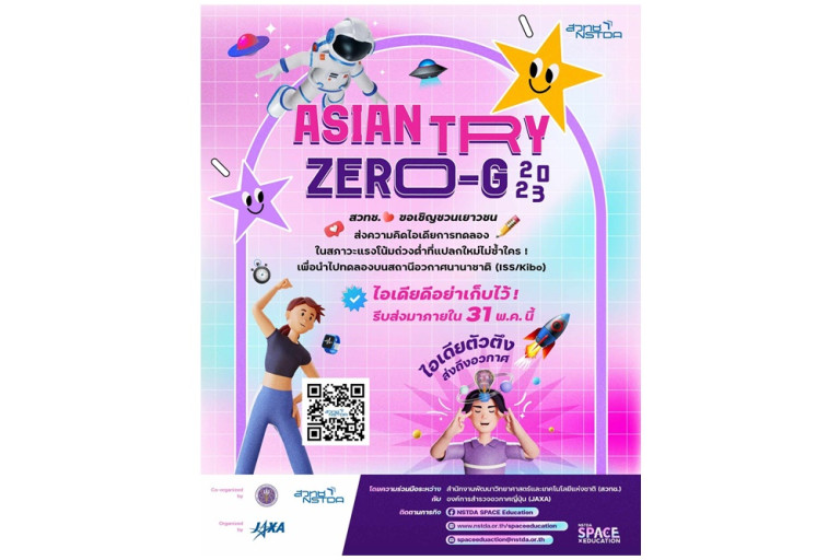 กระทรวงการอุดมศึกษา วิทยาศาสตร์ วิจัยและนวัตกรรม (อว.) โดยสำนักงานพัฒนาวิทยาศาสตร์และเทคโนโลยีแห่งชาติ (สวทช.) ร่วมกับองค์การสำรวจอวกาศญี่ปุ่น หรือ แจ็กซา (JAXA) ประเทศญี่ปุ่น จัดทำโครงการ “Asian Try Zero-G 2023” ชวนเยาวชนไทยส่ง “แนวคิดการทดลองในสภาวะแรงโน้มถ่วงต่ำเพื่อทดลองบนสถานีอวกาศนานาชาติ” ร่วมแข่งขันกับประเทศสมาชิกในภูมิภาคเอเชียแปซิฟิก โดยเปิดรับสมัครตั้งแต่วันนี้ถึงวันที่ 31 พฤษภาคม 2566