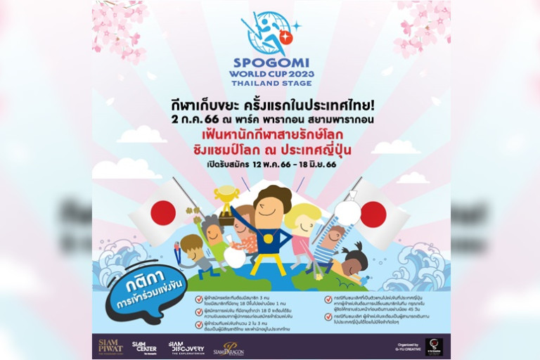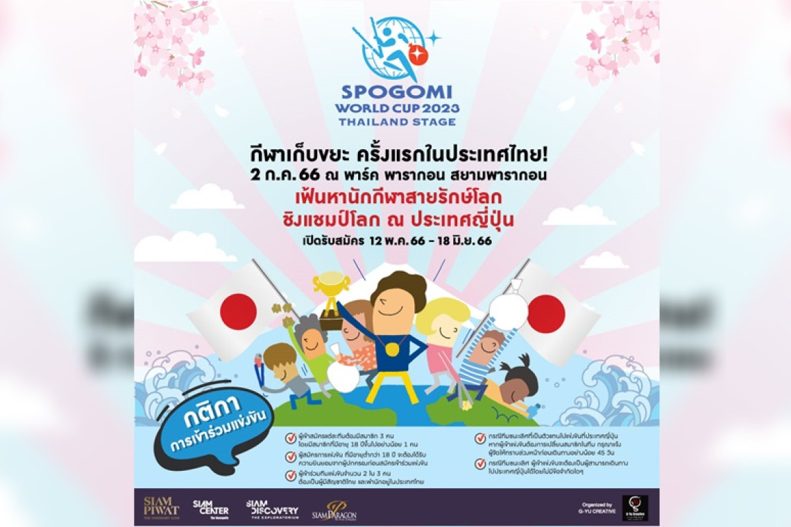 เพื่อร่วมเป็นส่วนหนึ่งของกิจกรรมอนุรักษ์สิ่งแวดล้อมสร้างสรรค์ระดับโลกนี้ กลุ่มบริษัทสยามพิวรรธน์ ร่วมกับ จี ยู ครีเอทีฟ ขอเชิญชวนเหล่าคนรักษ์โลกเข้าร่วมเเข่งขันกีฬาเก็บขยะครั้งแรกในประเทศไทย!!! ในงาน “SPOGOMI WORLD CUP 2023 THAILAND STAGE ” เพื่อเฟ้นหาตัวเเทนประเทศไทยไปเเข่งขันในระดับโลก โดยงานจะจัดขึ้นในวันอาทิตย์ที่ 2 กรกฎาคม 2566 ณ พาร์คพารากอน สยามพารากอน และร่วมชิงรางวัลสไตล์รักษ์โลก พร้อมร่วมกิจกรรมสุดสร้างสรรค์ที่ชวนให้ทุกคนมาร่วมด้วยช่วยกันลดโลกร้อนอีกมากมาย ผู้สนใจสามารถสมัครร่วมแข่งขันโดยไม่มีค่าใช้ใดๆ ได้ทางเว็บไซต์ https://www.gyucreative.com/spogomi-thailand/ ตั้งเเต่วันนี้ - 18 มิถุนายน 2566