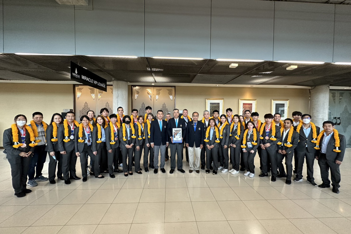 พลเอกชาญชัย ยศสุนทร เลขาธิการสมาคมกีฬาฟันดาบแห่งประเทศไทยฯ นำทีมคณะกรรมการบริหารสมาคมฯ ร่วมต้อนรับทัพนักกีฬาฟันดาบทีมชาติไทย ชุดสู้ศึกซีเกมส์ ครั้งที่ 32 ที่เดินทางถึงสนามบินสุวรรณภูมิในช่วงเที่ยงวันนี้ ด้วยเที่ยวบิน WE587