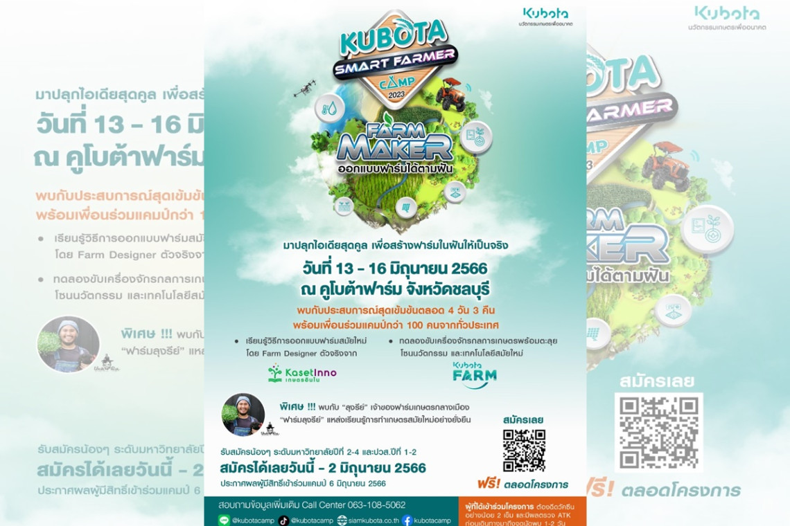 กลับมาอีกครั้ง!! กับที่สุดของแคมป์เกษตรแห่งปี "KUBOTA Smart Farmer Camp 2023" จากบริษัทสยามคูโบต้าคอร์ปอเรชั่น จำกัด ในธีม "FARM MAKER ออกแบบฟาร์มได้ตามฝัน" พร้อมจุดประกายเยาวชนในการสร้างฟาร์มในฝันให้เป็นจริง ผ่านการเรียนรู้นวัตกรรมเกษตร Smart Farming จากประสบการณ์จริงที่คูโบต้าฟาร์ม และการบริหารจัดการฟาร์มโดยผู้เชี่ยวชาญด้าน Farm Design จากบริษัท เกษตรอินโน จำกัด นอกจากนี้ยังมีวิทยากรรับเชิญ “ลุงรีย์” เจ้าของฟาร์มเกษตรกลางเมือง “ฟาร์มลุงรีย์” มาร่วมพูดคุยแนวคิดฟาร์มออแกนิกส์รักษ์โลก รวมถึง Food Waste และไอเดียการสร้างสรรค์เมนู OMAKAHED (โอมากะเห็ด) และทักษะการต่อยอดสู่การเป็นนักธุรกิจเกษตรผ่านเกมส์จำลองการวางแผนลงทุนด้านการเกษตร