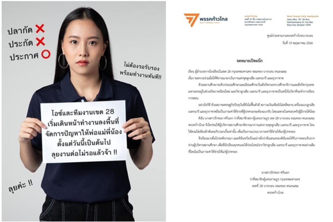 เมื่อวันที่ 20 พฤษภาคม 2566 นางสาวรักชนก ศรีนอก ว่าที่ ส.ส. กรุงเทพมหานครเขตบางบอน จอมทอง หนองแขม พรรคก้าวไกล ออกจดหมายเปิดผนึก ถึงผู้อำนวยการโรงเรียนในเขต 28 กรุงเทพมหานคร จอมทอง บางบอน หนองแขม เรื่อง "ขอความร่วมมือให้พิจารณายกเว้นการแต่งชุดลูกเสือ เนตรนารี และยุวกาชาด" โดยมีเนื้อหาดังนี้