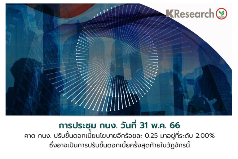 ศูนย์วิจัยกสิกรไทย ประเมินว่า ในการประชุมคณะกรรมการนโยบายการเงิน (กนง.) วันที่ 31 พ.ค.นี้ คาดว่า กนง. จะปรับขึ้นดอกเบี้ยนโยบายอีก 0.25% ซึ่งเป็นครั้งสุดท้ายในรอบวัฏจักรดอกเบี้ยขาขึ้น มาอยู่ที่ระดับ 2.00% ท่ามกลางแรงกดดันด้านเงินเฟ้อที่ลดลงอย่างมีนัยสำคัญ ประกอบกับแนวโน้มเศรษฐกิจไทยที่เผชิญความเสี่ยงมากขึ้น ขณะที่แรงกดดันจากแนวโน้มนโยบายการเงินแบบตึงตัวของธนาคารกลางต่างๆ ทั่วโลกเริ่มลดลง เนื่องจากธนาคารกลางหลัก เช่น ธนาคารกลางสหรัฐ (เฟด) เริ่มส่งสัญญาณหยุดขึ้นดอกเบี้ยในระยะอันใกล้