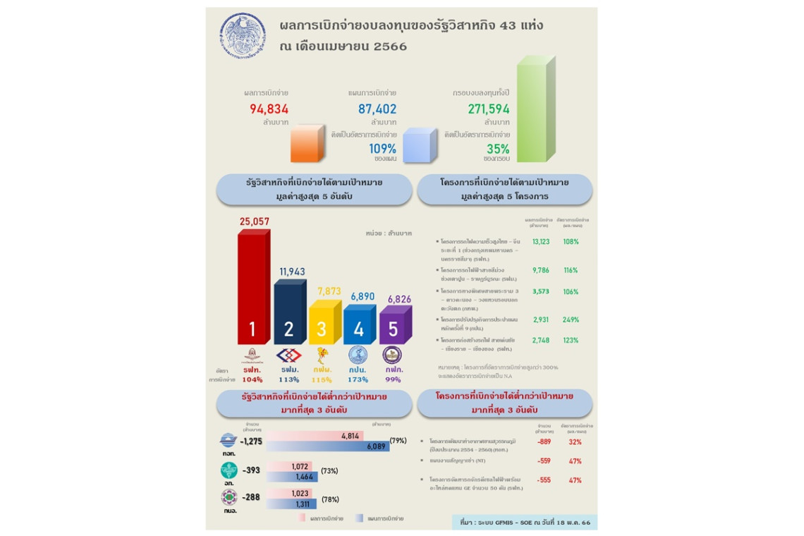 โดยผลการเบิกจ่ายงบลงทุน ณ สิ้นเดือนเมษายน 2566 เป็นผลการเบิกจ่ายของรัฐวิสาหกิจปีงบประมาณ 7 เดือน ซึ่งคิดเป็นร้อยละ 51 ของกรอบงบลงทุนทั้งปี และเป็นผลการเบิกจ่ายของรัฐวิสาหกิจปีปฏิทิน 4 เดือน คิดเป็นร้อยละ 21 ของกรอบงบลงทุนทั้งปี ทั้งนี้ สคร.จะกำกับติดตามให้รัฐวิสาหกิจเบิกจ่ายงบลงทุนให้เป็นไปตามเป้าหมายอย่างต่อเนื่องต่อไป