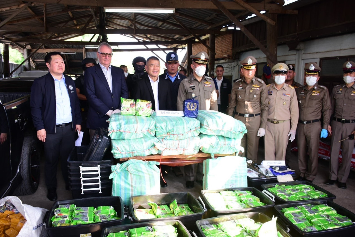 เมื่อเวลา 16.00 น.วันที่ 26 พฤษภาคม 2566 พล.ต.ท.ปิยะ ต๊ะวิชัย ผบช.ภ.5 พล.ต.ต.วีรชน บุญทวี รอง ผบช.ภ.5 พล.ต.ต.วรพงษ์ คำลือ ผบก.สส.ภ.5 นายวิชัย ไชยมงคล เลขาธิการสำนักงานป้องกันและปราบปรามยาเสพติด (ป.ป.ส.) นายอภิกิต ฉ.โรจน์ประเสริฐ ผู้อำนวยการสำนักงาน ป.ป.ส.ภาค 5 พล.ต.ต.ดุลย์เดชา อาวชวะสมิตระกูล ผบก.ภ.จว.ชียงราย พ.ต.อ.วัชรพันธ์ ปัญญาเนรมิตดี ผกก.สภ.พาน จ.เชียงราย และ ฯณฯ โจนาธาน คิงส์ เอกอัครราชทูตนิวซีแลนด์ประจำประเทศไทย เดินทางด้วยเฮลิคอปเตอร์ไปแถลงข่าวการจับกุมตัวนายสมพงษ์ อายุ 46 ปี ชาว ต.ธารทอง อ.พาน และนายบัณฑิต อายุ 34 ปี ณ พื้นที่ ต.ธารทอง อ.พาน จ.เชียงราย หลังจากทั้งหมดถูกจับกุมพร้อมยาไอซ์น้ำหนัก 400 กิโลกรัม อาวุธปืนและกระสุนปืน