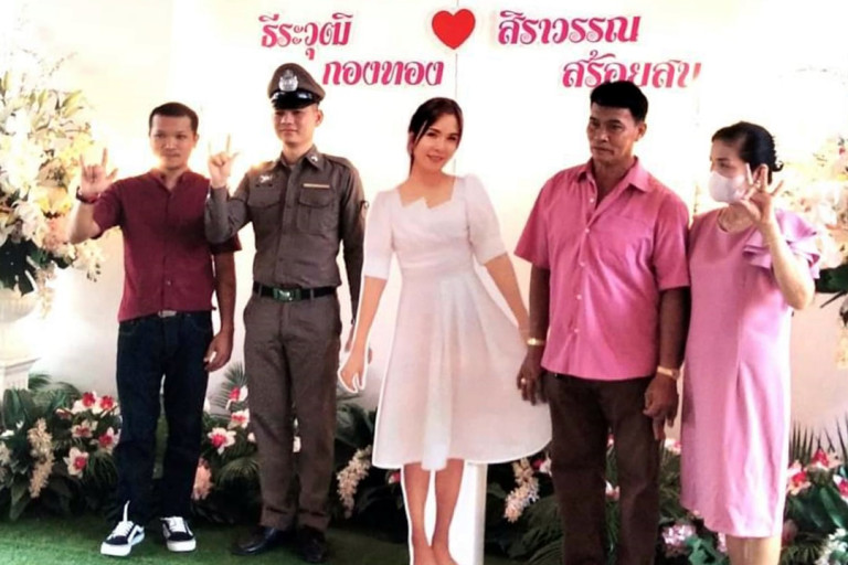 วันที่ 27 พ.ค.66 ภายในศาลาวัดเกาะเค็ดนอก หมู่ 10 ต.ไม้เค็ด อ.เมือง จ.ปราจีนบุรี ที่กำลังจัดงานศพอยู่นั้น ได้มีการจัดงานแต่งงานหน้าหีบศพผู้ตายที่ตั้งบำเพ็ญกุศลอยู่  โดยบริเวณภายในศาลาดังกล่าว ได้มีการจัดตกแต่งเสมือนงานแต่งงาน โดยมีญาติของผู้เสียชีวิต และตำรวจหนุ่มซึ่งเป็นฝ่ายเจ้าบ่าว คือ ส.ต.อ.ธีระวุฒิ กองทอง เป็นเจ้าหน้าที่ตำรวจสายตรวจประจำจุดโคกไม้ลาย อำเภอเมืองปราจีนบุรี  ได้เคยทำพิธีหมั้นหมายกับ น.ส.สิราวรรณ  สร้อยสน แฟนสาว เมื่อเดือนมีนาคมที่ผ่านมา และมีกำหนดที่จะจัดงานแต่งอีก 2 เดือน แต่แฟนสาวของตนได้ป่วยกะทันหัน ก่อนที่จะพักรักษาตัวอยู่โรงพยาบาล และเสียชีวิตในวันที่ 24 พฤษภาคม ที่ผ่านมา