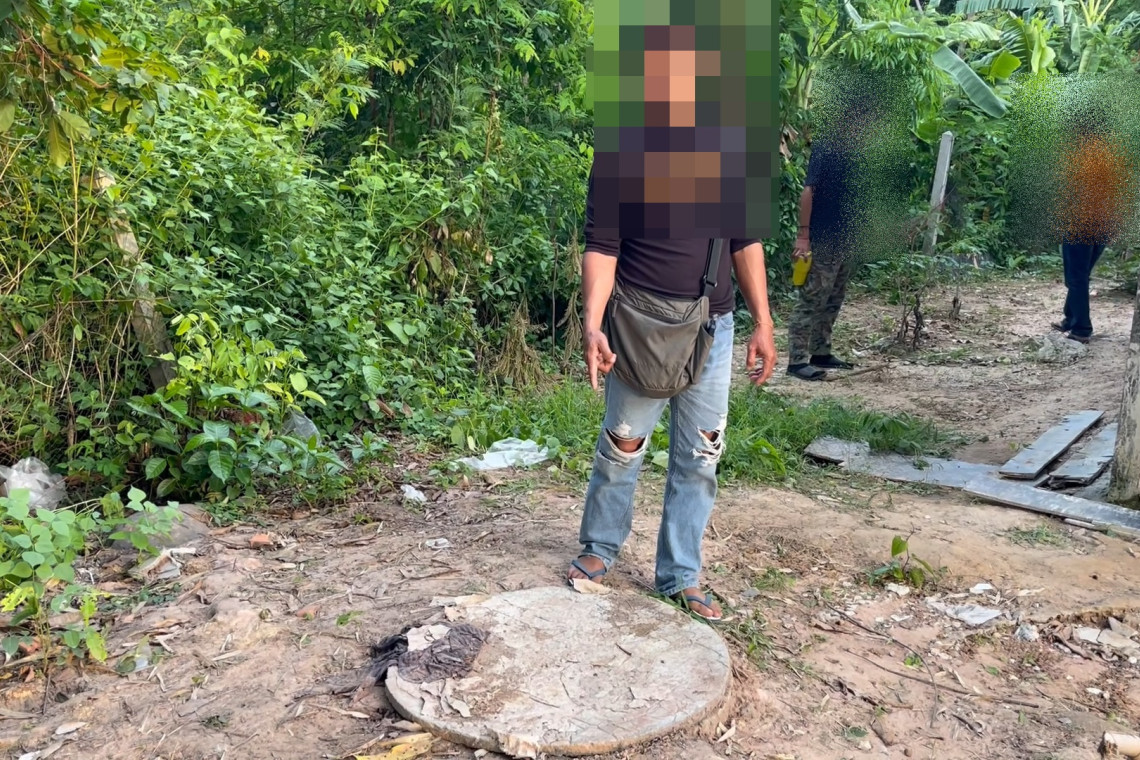 จากนั้นจึงย้อนกลับเข้าไปในบ้านหลังที่เกิดเหตุอีกครั้ง พบนายสมโฮง พี่ชายของตนเองก็ นั่งเฉยไม่พูดไม่จา และไม่ได้คลุ้มคลั่ง ตนเองจึงเดินไปดูที่หลังบ้านพบว่าฝาบ่อส้วม (บ่อเกรอะ) ผิดสังเกต ตนเองจึงได้เลื่อนฝาคอนกรีตของบ่อส้วมเปิดออกดูจึงพบว่าเด็กชายเอ บุตรชายของตนเอง นอนเสียชีวิตในลักษณะคว่ำหน้าอยู่ในบ่อส้วม จึงได้แจ้งเจ้าหน้าที่ตำรวจมาที่เกิดเหตุ ซึ่งตนเองไม่คิดว่าฆาตกรที่ลงมือฆ่าบุตรชายตนเอง จะเป็นพี่ชายแท้ๆ เพราะที่ผ่านมาพี่ชายได้ลงไปทำงานอยู่ที่กรุงเทพฯ แล้วเกิดป่วย จึงกลับลงมารักษาตัวอยู่ที่บ้านได้ประมาณ 3 เดือน ตนเองก็ดูแลรักษาจนอาการดีขึ้น ข้าวปลาอาหารก็หามาให้กิน ตนเองจะไม่ขออโหสิกรรมให้กับการกระทำของพี่ชาย ขอให้ทางเจ้าหน้าที่ตำรวจดำเนินคดีให้ถึงที่สุด