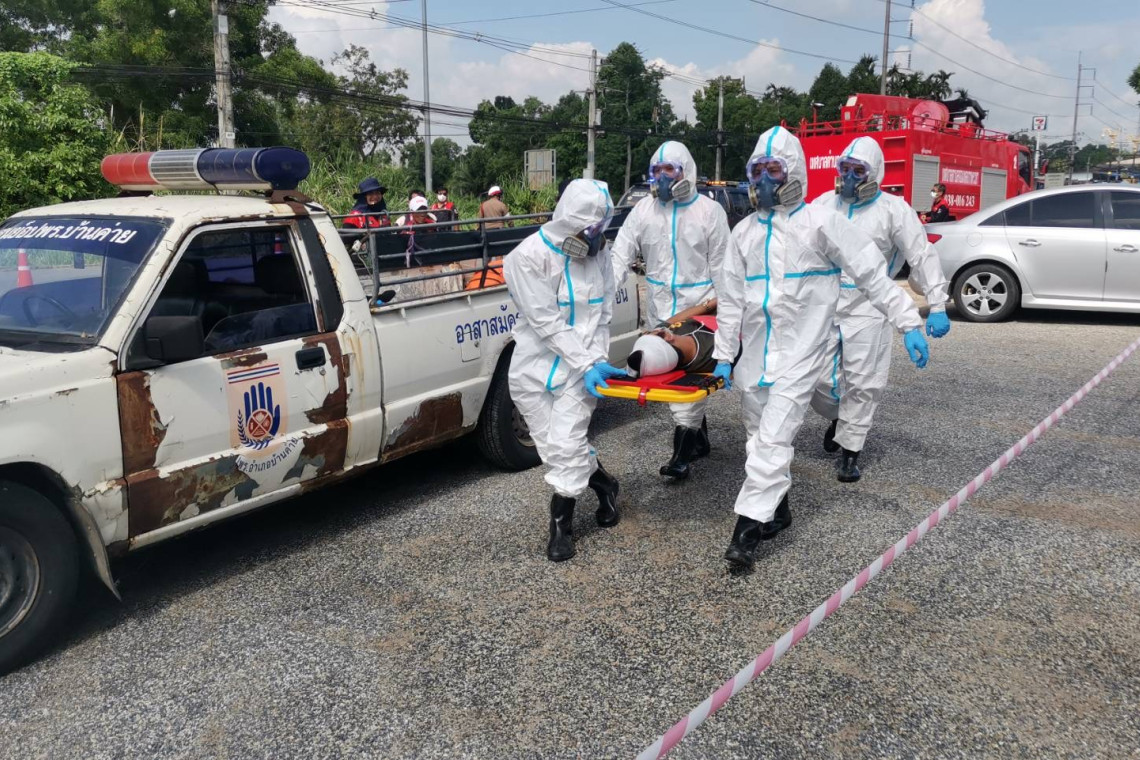 โดยได้มีการจำลองเหตุการณ์เกิดอุบัติเหตุรถยนต์ชนกับรถบรรทุกสารเคมีจนสารเคมีรั่วไหล เหตุเกิดบริเวณถนนสายบ้านค่าย-หนองละลอก ม.3 ต.หนองละลอก อ.บ้านค่าย มีผู้ได้รับบาดเจ็บ จำนวน 4 ราย ได้เจ้าหน้าที่ซักซ้อมการเข้าระงับเหตุ โดยสวมชุดป้องกันสารเคมี หรือ PPE เข้าช่วยเหลือผู้ได้รับบาดเจ็บออกจากที่เกิดเหตุส่ง รพ. ตลอดจนจัดเจ้ากน้าที่กันพื้นที่ไม่ให้ผู้ที่ไม่เกี่ยวข้องเข้าไปในที่เกิดเหตุ รวมทั้งการซักซ้อมแผนกู้รถสารเคมีรั่วไหล และการบัญชาการสั่งการ เป็นต้น ทั้งนี้เพื่อเป็นการเตรียมความพร้อมรับหากเกิดสถานการณ์จริงขึ้นจะสามารถเข้าไประงับเหตุได้ทันท่วงที
