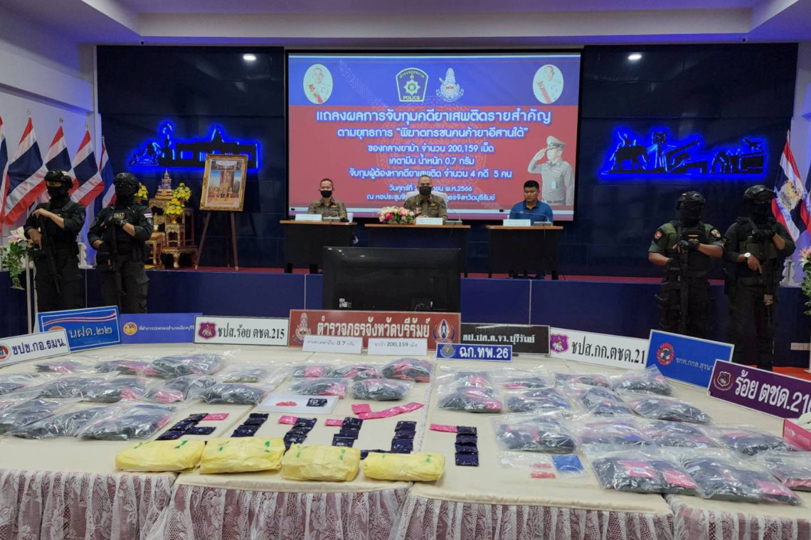 เมื่อเวลา 13.00 น. วันที่ 2 มิ.ย.66 ที่หอประชุมชัยจินดา ภ.จว.บุรีรัมย์ ต.ในเมือง อ.เมือง จ.บุรีรัมย์ พล.ต.ต.รุทธพล เนาวรัตน์ ผบก.ภ.จว.บุรีรัมย์ พ.ต.อ.ชูสิทธิ์ หล่อแสง รอง ผบก.ภ.จว.บุรีรัมย์ พ.ต.ท.วิชาญ กระจ่างโพธิ์ รอง ผกก.ฯ หัวหน้าชุดปฎิบัติการปราบปรามยาเสพติด ภ.จว.บุรีรัมย์ , พ.ต.ท.รัตนาธิเบศ แผ้วไพบูลย์ ผบ.ร้อย ตชด.216 , พ.ต.ไพบูลย์ ไชยนิคม รอง เสธ.ฉก.ทพ.26 แถลงข่าวผลการจับกุมผู้ต้องหาค้ายาเสพติด ตามแผนยุทธการ ‘พิฆาตทรชนคนค้ายาอีสานใต้’ โดยสามารถจับกุมผู้ต้องหาได้ 2 เครือข่าย จำนวน 4 คดี รวม5 คน ของกลางยาบ้าทั้งหมด 200,159 เม็ด และยาเค หรือเคตามีน น้ำหนักประมาณ 0.7 กรัม