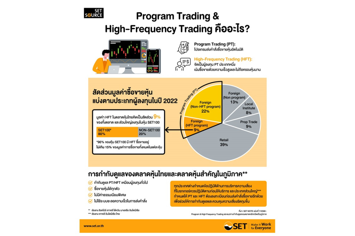การส่งคำสั่งซื้อขายหลักทรัพย์อัตโนมัติโดยประมวลผลและตัดสินใจซื้อขายด้วยโปรแกม หรือ program trading (PT) เป็นที่นิยมกันมากในกลุ่มนักลงทุนสถาบันทั่วโลก เพราะช่วยเพิ่มประสิทธิภาพในการส่งคำสั่งซื้อขาย โดยนักลงทุนกลุ่ม high-frequency trading (HFT) จัดเป็นนักลงทุน program trading ประเภทหนึ่ง ซึ่งใช้กลยุทธ์ที่เน้นความเร็วสูงและไม่นิยมถือครองหลักทรัพย์ไว้นาน โดย HFT คิดเป็นประมาณ 50% ของมูลค่าซื้อขายในตลาดหลักทรัพย์ในสหรัฐฯ และประมาณ 24-43% ของมูลค่าซื้อขายในตลาดหลักทรัพย์ในยุโรปในปี 2020 และ 9% ของมูลค่าซื้อขายในตลาดหลักทรัพย์ไทยในปี 2022 โดย 80% ของมูลค่าซื้อขายทั้งหมดของนักลงทุนกลุ่ม HFT กระจุกตัวอยู่เฉพาะในหลักทรัพย์ขนาดใหญ่(กลุ่ม SET100) และ 96% ของจำนวนหลักทรัพย์ใน SET100 มี HFT ร่วมซื้อขายอยู่เพียงไม่เกิน 15% ของมูลค่าซื้อขายในแต่ละหลักทรัพย์ ส่วนหลักทรัพย์ขนาดกลางและเล็ก (กลุ่มนอก SET100) พบว่าเกือบทั้งหมดมี HFT ร่วมซื้อขายอยู่ไม่เกิน 10%