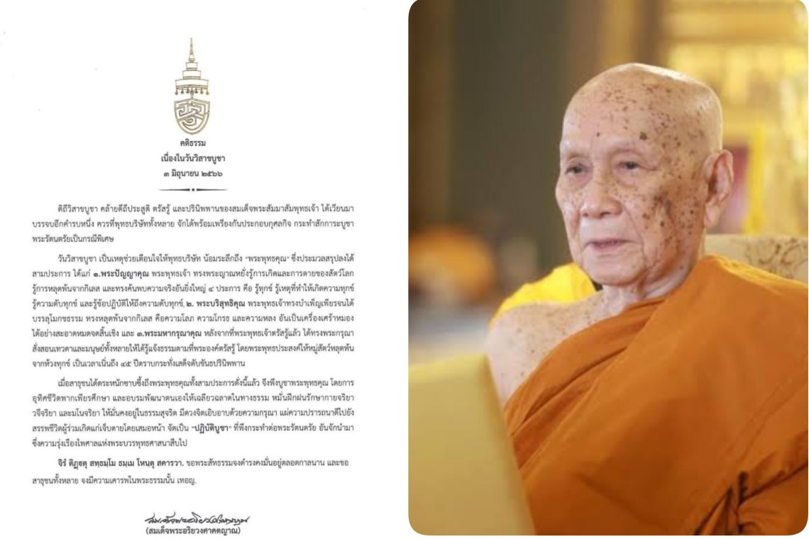 วันที่ 3 มิ.ย. 2566 -เพจกรมประชาสัมพันธ์ ได้โพสต์ข้อความและภาพผ่านเฟสบุ๊ค ถึงคติธรรมเนื่องในวันวิสาขบูชา วันเสาร์ ที่ 3 มิถุนายน 2566 เจ้าพระคุณ สมเด็จพระอริยวงศาคตญาณ สมเด็จพระสังฆราช สกลมหาสังฆปริณายก ประทานพระคติธรรม ความว่า