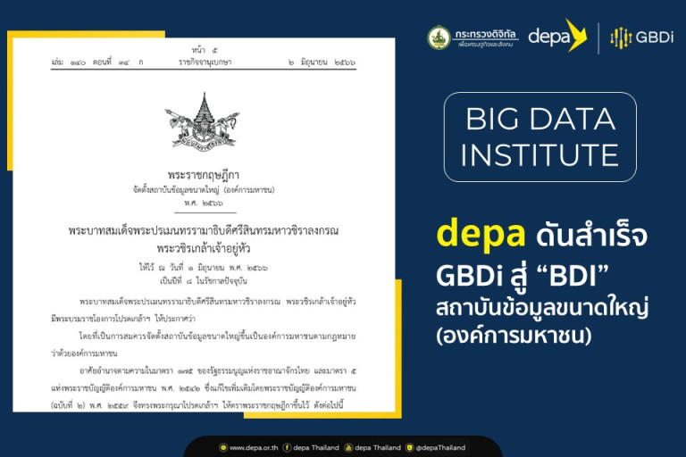 "ที่ผ่านมา กระทรวงดิจิทัลเพื่อเศรษฐกิจและสังคม โดย ดีป้า มุ่งขับเคลื่อนให้เกิดการใช้ประโยชน์จากข้อมูลขนาดใหญ่ ซึ่งถือเป็นวาระสำคัญระดับชาติโดยการดำเนินงานของ สถาบันส่งเสริมการวิเคราะห์และบริหารข้อมูลขนาดใหญ่ภาครัฐ (GBDi) หน่วยงานในสังกัด ด้วยการทำงานของกลุ่มคนรุ่นใหม่ มีภารกิจสำคัญในการขับเคลื่อนให้เกิดการใช้ประโยชน์จากข้อมูลขนาดใหญ่ทั้งภาครัฐและภาคเอกชน โดยบูรณาการการทำงานไปแล้วกว่า 100 โครงการกับ 67 หน่วยงาน พร้อมกันนี้ยังมีการพัฒนาแพลตฟอร์มเชื่อมโยงข้อมูลสุขภาพ (Health Link) ระบบรวบรวมข้อมูลด้านการท่องเที่ยว (Travel Link) ระบบเชื่อมโยงข้อมูลเด็กและเยาวชน (Youth Link) และระบบเชื่อมโยงข้อมูลเพื่อการบริหารสถานการณ์การแพร่ระบาดของโรคติดเชื้อไวรัสโควิด-19 (CO-Link) เพื่อเป็นประโยชน์สำหรับประชาชนไทย ซึ่งการยกระดับสู่ BDI ในครั้งนี้จะเป็นกำลังสำคัญในการยกระดับเศรษฐกิจและสังคมของประเทศด้วยข้อมูลขนาดใหญ่อย่างเป็นรูปธรรม"