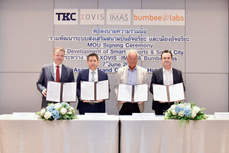 นายสยาม เตียวตรานนท์ กรรมการผู้จัดการ บริษัท เทิร์นคีย์ คอมมูนิเคชั่น เซอร์วิส จำกัด (มหาชน) หรือ TKC และ นายปีเตอร์ นิโคลัส CEO บริษัท ไอเอ็มเอเอส (ประเทศไทย) จำกัด (IMAS), นายรูเพิร์ต ปารีส CEO บริษัท โซวิส จำกัด (มหาชน) (Xovis), นายสเตฟาน ลิเลสแตรนด์ CSO & Founder บริษัท บัมบี แลบส์ จำกัด (Bumbeelabs) ถ่ายภาพเป็นที่ระลึกร่วมกันภายหลังพิธีลงนามความร่วมมือพัฒนาระบบส่งเสริมสนามบินอัจฉริยะ และเมืองอัจฉริยะ (MOU Signing Ceremony For Development of Smart Airports & Smart City) ณ ห้องพระเอราวัณ 2 โรงแรมอัศวิน แกรนด์ คอนเวนชั่น