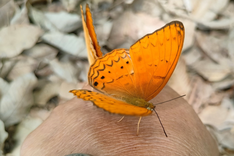 โดยเฉพาะชาวบ้านที่อยู่ในพื้นที่ต.ท่ากระดาน อ.สนามชัยเขต จ.ฉะเชิงเทรา ทางตอนเหนือของเขตรักษาพันธุ์สัตว์ป่าเขาอ่างฤาไนซึ่งเป็นป่าผืนราบ ที่มีพื้นที่เกษตรกรรมติดต่อกันกับผืนป่านั้น สามารถที่จะสัมผัสกับบรรดาฝูงผีเสื้อเหล่านี้ได้อย่างใกล้ชิด โดยเฉพาะผู้ที่เข้ามาทำงานภายในสวนจนมีเหงื่อไคลไหลออกมาในปริมาณมากนั้น จะถูกเหล่าผีเสื้อที่มีลำตัวและแผงปีกเป็นแผ่นบางเบาอันสวยงามเหล่านี้ เข้ามารุมตอมเกาะอยู่ที่ตามผิวหนังของมนุษย์ให้ผู้คนได้สัมผัสได้อย่างใกล้ชิดด้วยความสมัครใจ