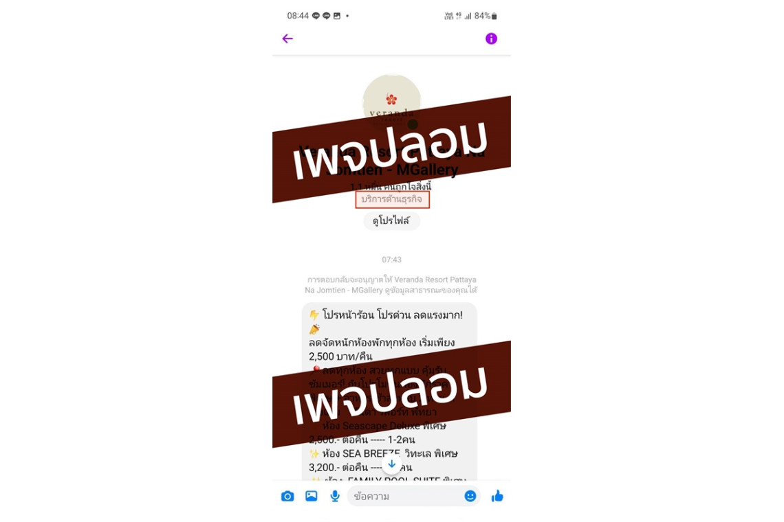 บมจ.วีรันดา รีสอร์ท หรือ VRANDA แจ้งเตือนภัยประชาชนและนักท่องเที่ยว หลังพบมิจฉาชีพปลอมแปลงเพจ แอบอ้างเป็นพนักงานวีรันดา รีสอร์ท พัทยา นาจอมเทียน นำเสนอโปรโมชันห้องพักราคาถูกและให้โอนเงินชำระค่าห้องเข้าบัญชีมิจฉาชีพ พบถูกหลอกแล้วกว่า 70 ราย มูลค่าความเสียหายต่อผู้บริโภคกว่า 400,000 บาท