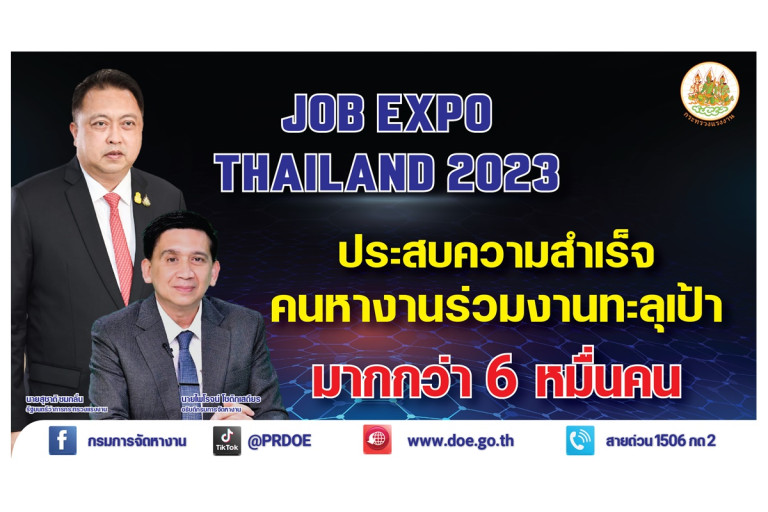 นายสุชาติ ชมกลิ่น รมว.แรงงาน เปิดเผยถึงผลการจัดงาน Job Expo Thailand 2023 ที่จัดขึ้นระหว่างวันที่ 8 – 10 มิถุนายน 2566 เป็นเวลา 3 วันว่า มีผู้เข้าร่วมงาน ณ ศูนย์นิทรรศการและการประชุมไบเทค กรุงเทพมหานคร จำนวน 46,883 คน และลงทะเบียนร่วมงานผ่านระบบออนไลน์ จำนวน 18,441 คน รวมทั้งสิ้น 65,324 คน ในจำนวนนี้มีผู้ลงทะเบียนสมัครงานในประเทศ จำนวน 19,347 คน สมัครงานผ่านระบบออนไลน์ 7,739 คน รวมใช้บริการสมัครงาน จำนวน 33,957 ครั้ง คาดว่าได้รับการบรรจุงานทันที จำนวน 1,063 คน ที่เหลืออยู่ระหว่างรอการพิจารณาจากสถานประกอบการ โดยตำแหน่งที่ลงทะเบียนสมัครงานมากที่สุด 5 ลำดับแรก ได้แก่ พนักงานบริการลูกค้า พนักงานขายในสถานประกอบการค้าปลีก แรงงานด้านการผลิต พนักงานบริการท่าอากาศยาน และเสมียน/พนักงานทั่วไป/พนักงานธุรการ