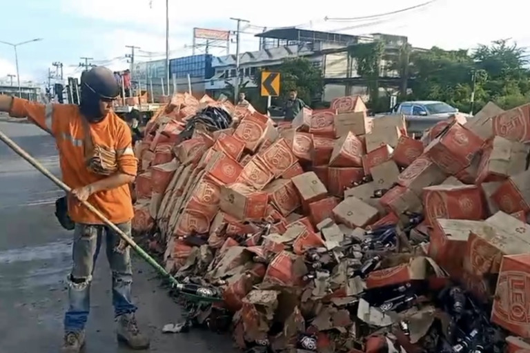 วันที่ 13 มิ.ย.66 ที่จังหวัดนครปฐม เจ้าหน้าที่ตำรวจเมืองนครปฐมได้รับแจ้งเหตุรถบรรทุกเทรลเลอร์เสียหลักพลิกคว่ำ บนถนนสายมาลัยแมน บริเวณโค้งหักศอก บ้านหนองงูเหลือม ต.หนองงูเหลือม อ.เมือง จ.นครปฐม ขาเข้านครปฐม ทำให้การจราจรชะลอตัวเพราะมีทั้งซากรถและลังเบียร์กระจายอยู่ทั่วผิวจราจร