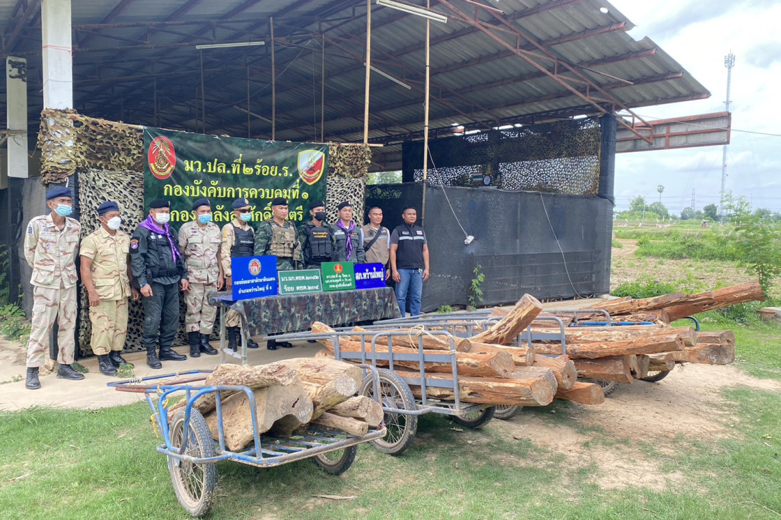 มุกดาหาร/ เมื่อวันที่ 13 มิ.ย.66 นำโดย ร.ต.พีระพันธุ์ พานนท์ ผบ.มว.ปล.ที่ 2 กกล.สุรศักดิ์มนตรี ได้รับแจ้งจากสายข่าวว่าจะมีการลักลอบขนไม้หวงห้ามแปรรูป ข้ามไปยังฝั่งประเทศเพื่อนบ้าน สปป.ลาว จึงได้จัดกำลังพลลาดตระเวนในพื้นที่ หมู่ 6 บ.ทรายทอง ต.บางทรายน้อย อ.หว้านใหญ่ จ.มุกดาหาร ครั้นเมื่อเวลา 21.30 น. เจ้าหน้าที่ชุดลาดตระเวนได้ตรวจพบกลุ่มคนประมาณ 4-5 คน กำลังขนวัตถุต้องสงสัยลงมาบริเวณริมฝั่งแม่น้ำโขง หมู่ 6 บ.ทรายทอง ต.บางทรายน้อย อ.หว้านใหญ่ จ.มุกดาหาร พิกัด 48 QVD 727411 เจ้าหน้าที่จึงได้แสดงตัวว่าเป็นเจ้าหน้าที่ทหาร เพื่อทำการขอตรวจค้น กลุ่มคนดังกล่าวเมื่อพบเห็นเจ้าหน้าที่ ต่างตื่นตกใจและได้อาศัยความมืดวิ่งหลบหนีไป เจ้าหน้าที่ได้วิ่งไล่ติดตามกลุ่มคนดังกล่าวไป จนถึงบริเวณกลางทุ่งนา ได้มีคนตะโกนส่งสัญญาณเสียงขึ้นว่า มีเจ้าหน้าที่ทหารมา กลุ่มคนประมาณ 5-6 คน อีกกลุ่มที่อยู่บริเวณเล้าไก่หลังบ้านได้ลุกขึ้นวิ่งหลบหนีไป เมื่อเจ้าหน้าที่ได้ไล่ติดตามมาถึงบริเวณเล้าไก่หลังบ้านไม่ทราบบ้านเลขที่ กลุ่มคนที่ได้ไล่ติดตามมาได้อาศัยความชำนาญในพื้นที่หลบหนีไปได้ เจ้าหน้าที่ได้ทำการตรวจสอบบริเวณเล้าไก่ บ.ทรายทอง ต.บางทรายน้อย อ.หว้านใหญ่ จ.มุกดาหาร พิกัด 48 QVD 722412 พบว่ามีไม้พะยูงที่ทำการขนขึ้นไว้บนรถเข็น จำนวน 3 ล้อ ตรวจนับได้ 23 ท่อน/เหลี่ยม