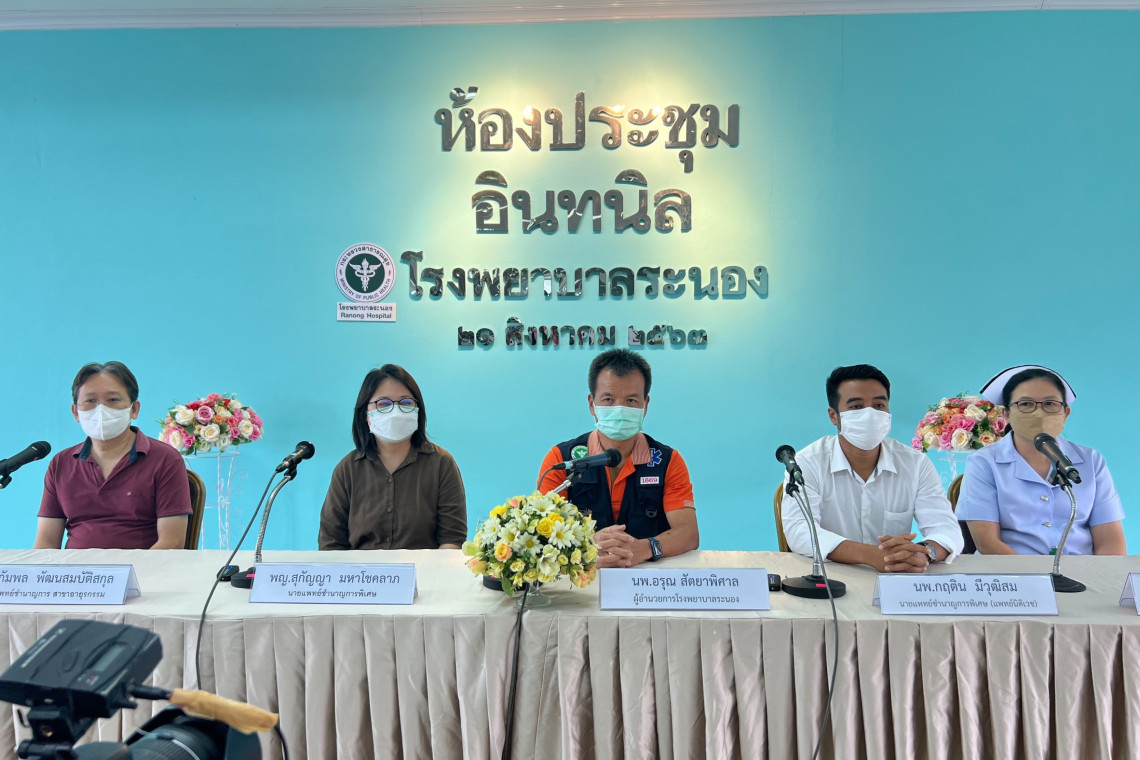 ความคืบหน้าล่าสุดเมื่อเวลา 11.00 น.วันที่ 15 พฤษภาคม 2566 ที่ผ่านมา ห้องประชุมอินทนิล ชั้น 2 โรงพยาบาลระนอง นายแพทย์อรุณ สัตยาพิศาล ผู้อำนวยการโรงพยาบาลระนอง นายแพทย์กฤติน มีวุฒิสม นายแพทย์ชำนาญการพิเศษ นางกาญจนา เพชรอาวุธ พยาบาลวิชาชีพชำนาญการ และคณะแพทย์ร่วมกันแถลงข่าวถึงเรื่องที่เกิดขึ้น