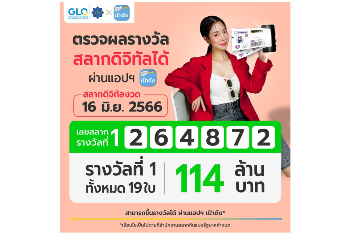 สลากดิจิทัล ในงวด 16 มิ.ย.66 โดยรางวัลที่ 1 หมายเลข 264872 พบว่า จำนวนสลากที่ถูกรางวัลรวม 19 ใบ เป็นเงินรางวัล 114 ล้านบาท แบ่งเป็น ถูก 1 ใบ จำนวน 8 คน ถูก 2 ใบ จำนวน 3 คน และ ถูก 5 ใบ จำนวน 1 คน