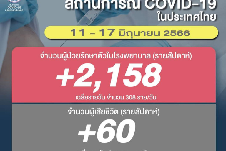 วันที่ 19 มิ.ย.2566 ศูนย์ข้อมูล COVID-19 กรมประชาสัมพันธ์ รายงานสถานการณ์โรคโควิด-19 รายสัปดาห์ เกาะติดยอดผู้ติดเชื้อโควิด-19 รายสัปดาห์ ระหว่างวันที่ 11 - 17 มิถุนายน 2566 พบผู้ป่วยรักษาตัวในโรงพยาบาล (รายสัปดาห์) จำนวน 2,158 ราย : เฉลี่ยรายวัน จำนวน 308 ราย/วัน ผู้เสียชีวิต (รายสัปดาห์) จำนวน 60 ราย : เฉลี่ยรายวัน จำนวน 8 ราย/วัน ทั้งนี้พบยอดป่วยสะสม 25,991 ราย (ตั้งแต่ 1 มกราคม 2566)เสียชีวิตสะสม 623 ราย (ตั้งแต่ 1 มกราคม 2566)