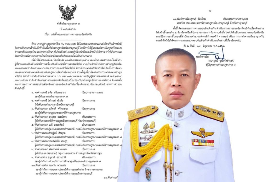 วันที่ 19 มิ.ย.66 ที่ บช.ภ.7 พล.ต.ท.ธนายุตม์ วุฒิจรัสธำรงค์ ผู้บัญชาการตำรวจภูธรภาค 7 ลงนามคำสั่งตำรวจภูธรภาค 7 ที่ 392/2566 เรื่อง แต่งตั้งคณะกรรมการตรวจสอบข้อเท็จจริงด้วย ปรากฎว่ายูทูปเปอร์ชื่อ my mate nate ได้มีการเผยแพร่คอนเทนต์เกี่ยวกับเจ้าหน้าที่ติดตามจับกุมคนร้ายในตึกร้างในพื้นที่ตำรวจภูธรจังหวัดกาญจนบุรี โดยมีการใช้ผู้แสดงแต่งกายในชุดเครื่องแบบตำรวจพร้อมอาวุธปืน และอุปกรณ์อื่นๆ ที่เกี่ยวข้องกับการปฏิบัติหน้าที่ของเจ้าหน้าที่ตำรวจ ทำให้เกิดกระแสวิพากษ์วิจารณ์จากประชาชนในเรื่องดังกล่าวทางสื่อสังคมออนไลน์เป็นจำนวนมาก เพื่อให้ได้รายละเอียด ข้อเท็จจริง และเป็นธรรมแก่ทุกฝ่าย และเป็นการพิจารณาเบื้องต้นว่าผู้ที่ร่วมแสดงเป็นเจ้าหน้าที่ตำรวจนั้น เป็นเจ้าหน้าที่ตำรวจจริงหรือไม่ หากเป็นเจ้าหน้าที่ตำรวจจริงอยู่สังกัดใดและการกระทำดังกล่าวเหมาะสม สามารถกระทำได้หรือไม่ มีกรณีกระทำผิดวินัยหรือไม่ อีกทั้งการจัดทำและเผยแพร่คอนเทนต์ดังกล่าวผิดกฎหมายใดหรือไม่ อย่างไร รวมทั้งผู้เกี่ยวข้องมีการะกระทำผิดทางอาญา หรือไม่ อย่างไร อาศัยอำนาจตามมาตรา 66 และ 179 แห่งพระราชบัญญัติตำรวจแห่งชาติ พ.ศ.2565 และระเบียบ คำสั่งสำนักงานตำรวจแห่งชาติเกี่ยวกับเรื่องร้องเรียนร้องทุกข์ข้าราชการตำรวจ
