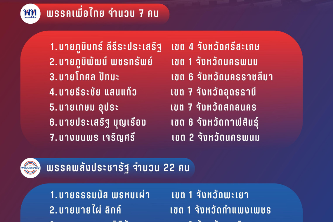 10.นายปกรณ์ จีนาคำ ส.ส.แม่ฮ่องสอน พรรคพลังประชารัฐ 11.นายสุธรรม จริตงาม ส.ส.นครศรีธรรมราช พรรคพลังประชารัฐ 12.นายธีระชัย แสนแก้ว ส.ส.อุดรธานี พรรคเพื่อไทย 13.นายชนนพัฒฐ์ นาคสั้ว ส.ส.สงขลา พรรคพลังประชารัฐ 14.นางรัชนี พลซื่อ ส.ส.ร้อยเอ็ด พรรคพลังประชารัฐ 15.นางบุญยิ่ง นิติกาญจนา ส.ส.ราชบุรี พรรคพลังประชารัฐ 16.นายนเรศ ธำรงทิพยคุณ ส.ส.เชียงใหม่ พรรคพลังประชารัฐ 17.นายอามินทร์ มะยูโซ๊ะ ส.ส.นราธิวาส พรรคพลังประชารัฐ 18.นายสัมพันธ์ มะยูโซ๊ะ ส.ส.นราธิวาส พรรคพลังประชารัฐ