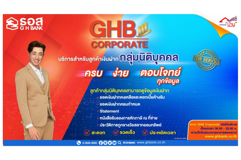 ธนาคารอาคารสงเคราะห์ (ธอส.) เปิดบริการใหม่ “GHB Corporate” เพิ่มทางเลือกสำหรับลูกค้าเงินฝากกลุ่มนิติบุคคลให้ได้รับความสะดวก รวดเร็ว และประหยัดเวลาในการตรวจเช็คข้อมูลเงินฝากผ่านเว็บไซต์ ธอส. ที่ www.ghbank.co.th ได้ทุกวันตั้งแต่เวลา 06.00-22.00 น. โดยไม่ต้องเดินทางมาที่สาขา ซึ่งลูกค้าสามารถเข้าตรวจสอบได้ทั้งยอดเงินฝากคงเหลือและดอกเบี้ยค้างรับ,ยอดเงินฝากครบกำหนด, Statement, หนังสือรับรองการหักภาษี ณ ที่จ่าย และประวัติการถูกรางวัลสลากออมทรัพย์ ธอส. เพียงเข้าไปที่ www.ghbank.co.th จากนั้นเข้าไปที่บริการ “GHB Corporate” ลงทะเบียน และดาวน์โหลดแบบฟอร์มขอใช้บริการ โดยลูกค้าสามารถเข้าสู่ระบบเพื่อรับบริการได้ทันที เพียงเท่านี้ก็จะสามารถตรวจสอบข้อมูลเงินฝากดังกล่าวได้ ผู้ที่
