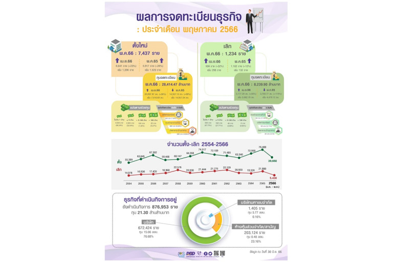 โดยธุรกิจดําเนินกิจการอยู่ทั้งสิ้น (ณ วันที่ 31 พ.ค. 66) ธุรกิจที่ดําเนินกิจการอยู่ทั่วประเทศ จํานวน 876,953 ราย มูลค่าทุน 21.30 ล้านล้านบาท จําแนกเป็นบริษัทจํากัด จํานวน 672,424 ราย คิดเป็น 76.68% ห้างหุ้นส่วนจํากัด/ห้างหุ้นส่วนสามัญนิติบุคคล จํานวน 203,124 ราย คิดเป็น 23.16% และบริษัทมหาชนจํากัด จํานวน 1,405 ราย คิดเป็น 0.16% ตามลําดับ และแบ่งตามช่วงทุน ธุรกิจส่วนใหญ่มีช่วงทุนไม่เกิน 1 ล้านบาท จํานวน 514,064 ราย คิดเป็น 58.62% รวมมูลค่าทุน 0.45 ล้านล้านบาท คิดเป็น 2.12% ช่วงทุนมากกว่า 1-5 ล้านบาท จํานวน 267,733 ราย คิดเป็น 30.53% รวมมูลค่าทุน 0.92 ล้านล้านบาท คิดเป็น 4.30% ช่วงทุนมากกว่า 5-100 ล้านบาท จํานวน 77,522 ราย คิดเป็น 8.84% รวมมูลค่าทุน 2.13 ล้านล้านบาท คิดเป็น 9.98% และช่วงทุนมากกว่า 100 ล้านบาท จํานวน 17,634 ราย คิดเป็น 2.01% รวมมูลค่าทุน 17.81 ล้านล้านบาท คิดเป็น 83.60% ตามลําดับ