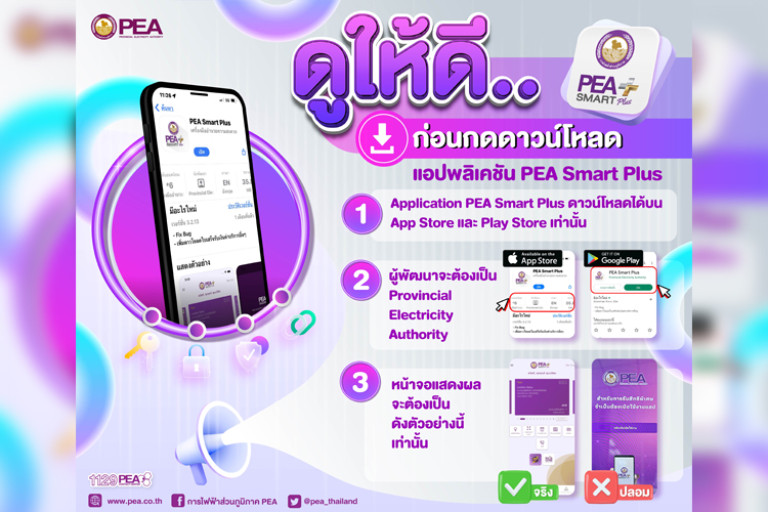 PEA แจ้งเตือนประชาชน  ดาวน์โหลดแอปพลิเคชัน PEA Smart Plus จาก App Store และ Google Play เท่านั้น  เพื่อความมั่นใจ ตรวจสอบก่อนดาวน์โหลดให้ชัดเจน ผู้พัฒนาต้องเป็น Provincial Electricity Authority