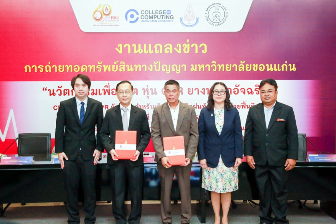 มหาวิทยาลัยขอนแก่น โดย ฝ่ายนวัตกรรมและวิสาหกิจ พร้อมด้วย วิทยาลัยการคอมพิวเตอร์ ศูนย์หัวใจสิริกิติ์ ภาคตะวันออกเฉียงเหนือ ร่วมกับ บริษัทเอเอ็ม หุ่นซีพีอาร์ จำกัด ลงนามการถ่ายทอดทรัพย์สินทางปัญญามหาวิทยาลัยขอนแก่น “นวัตกรรมเพื่อชีวิต หุ่น CPR ยางพาราอัจฉริยะ ” CPRobot (ซี-โปร-บ็อท) : หุ่น CPR อัจฉริยะสำหรับเรียนรู้และ ฝึกฝนทักษะการช่วยฟื้นคืนชีพ โดยมี รศ.นพ.ชาญชัย พานทองวิริยะกุล อธิการบดีมหาวิทยาลัยขอนแก่น นายอำนาจ เกิดอนันต์ กรรมการบริษัทเอเอ็ม หุ่นซีพีอาร์ จำกัด รศ.สิรภัทร เชี่ยวชาญวัฒนา คณบดีวิทยาลัยการคอมพิวเตอร์ รศ.นพ.ภัทรพงษ์ มกรเวช ผู้อำนวยการศูนย์หัวใจสิริกิติ์ ภาคตะวันออกเฉียงเหนือ ผศ.สายยัญ สายยศ หัวหน้าโครงการฯ ณ ห้องประชุมสารสิน ชั้น 2 อาคารสิริคุณากร มหาวิทยาลัยขอนแก่น