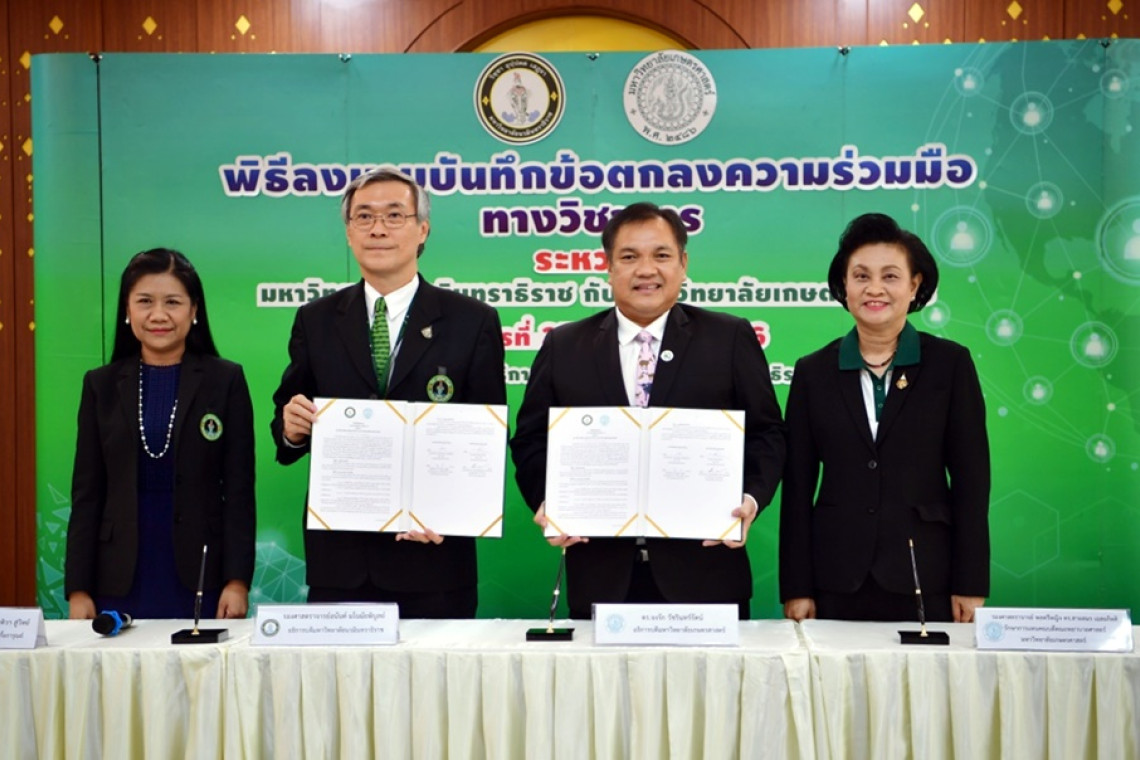วันที่ 27 มิ.ย.66 ดร.จงรัก วัชรินทร์รัตน์ อธิการบดีมหาวิทยาลัยเกษตรศาสตร์ ร่วมลงนามความร่วมมือทางวิชาการ กับ รศ.นพ.อนันต์ มโนมัยพิบูลย์ อธิการบดีมหาวิทยาลัยนวมินทราธิราช ในการสร้างเสริมคุณภาพและความเข้มแข็งทางวิชาการเพื่อการผลิตหลักสูตรพยาบาลศาสตรบัณฑิตให้เป็นไปอย่างมีคุณภาพและมาตรฐาน ตลอดจนให้คำปรึกษา แนะนำเกี่ยวกับการบริหาร และการจัดการเรียนการสอน การวิจัย บริการวิชการ การสร้างเครือข่ายการศึกษา และการจัดกิจกรรมอื่น ๆ ร่วมกัน เพื่อให้เป็นไปตามข้อบังคับสภาการพยาบาลว่าด้วยหลักเกณฑ์การรับรองสถาบันการศึกษาวิชาการพยาบาล และการผดุงครรภ์ โดยมีคณะพยาบาลศาสตร์เกื้อการุณย์ มหาวิทยาลัยนวมินทราธิราช เป็นสถาบันพี่เลี้ยงให้แก่คณะพยาบาลศาสตร์ มหาวิทยาลัยเกษตรศาสตร์ ทั้งนี้ รศ.ดร.บุญทิวา สู่วิทย์ คณบดีคณะพยาบาลศาสตร์เกื้อการุณย์ มหาวิทยาลัยนวมินทราธิราช และ รศ.พลตรีหญิง ดร.สายสมร เฉลยกิตติ คณบดีคณะพยาบาลศาสตร์ มหาวิทยาลัยเกษตรศาสตร์ ร่วมลงนามเป็นพยาน ณ บริเวณโถงชั้น 1 อาคารเกษมศรี สำนักงานอธิการบดี มหาวิทยาลัยนวมินทราธิราช