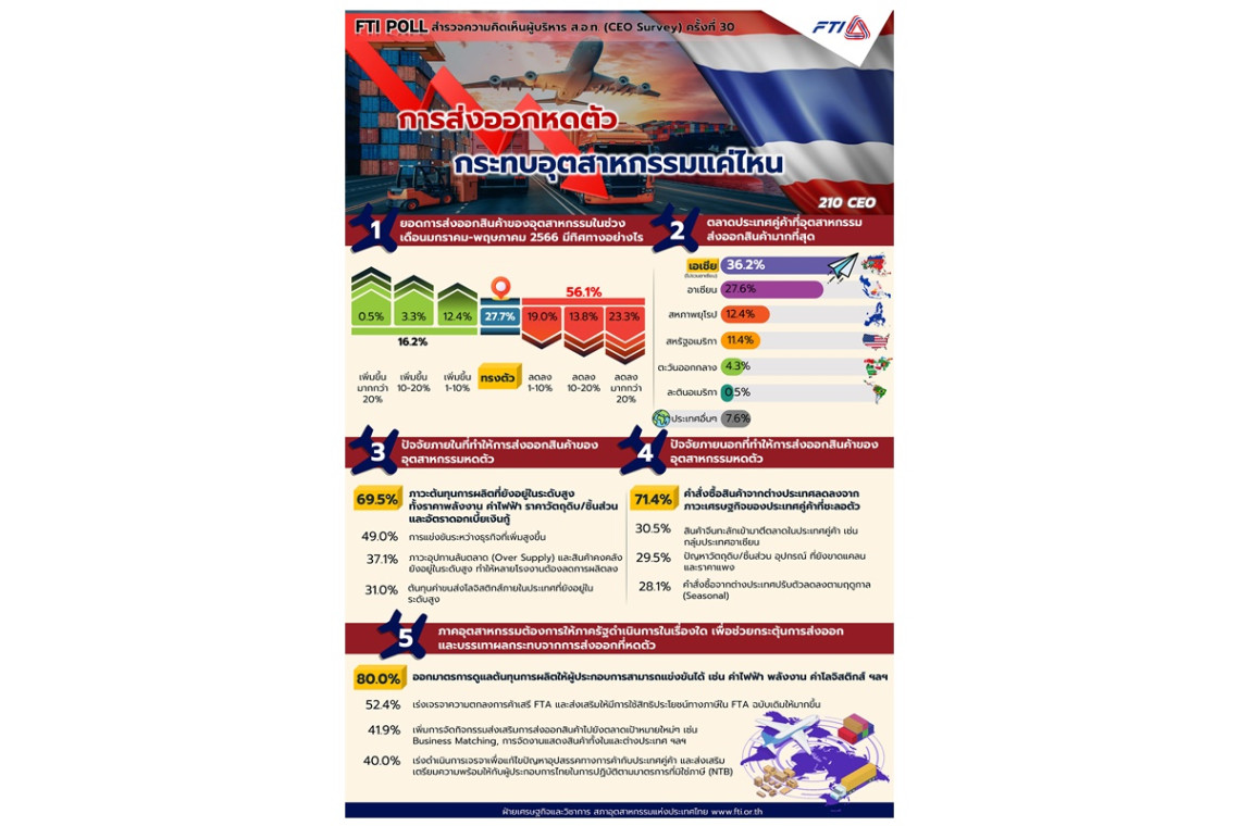 ทั้งนี้จากการสำรวจผู้บริหาร ส.อ.ท. (CEO Survey) จำนวน 210 ท่าน ครอบคลุมผู้บริหารจาก 45 กลุ่มอุตสาหกรรม และ 76 สภาอุตสาหกรรมจังหวัด มีสรุปผลการสำรวจ FTI Poll ครั้งที่ 30 จำนวน 5 คำถาม ดังนี้