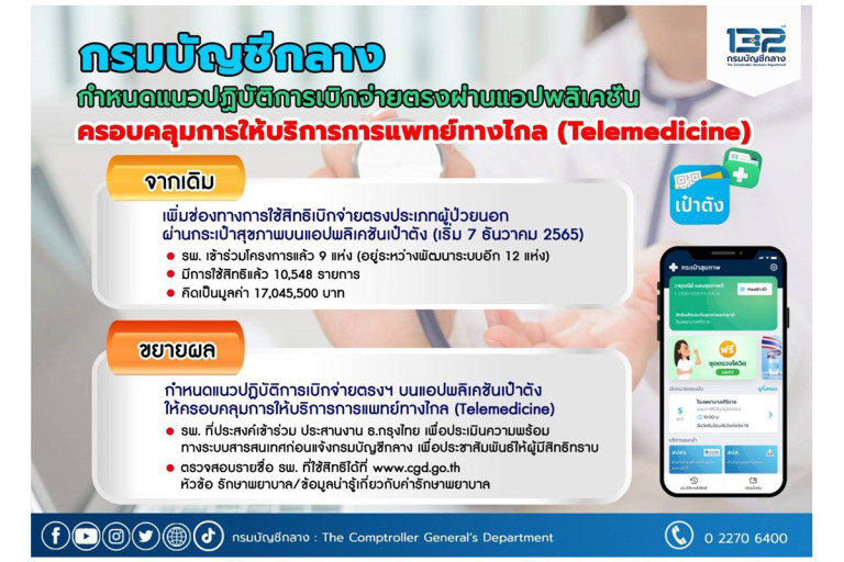 กรมบัญชีกลางกำหนดแนวปฏิบัติการเบิกจ่ายตรงผ่านแอปพลิเคชัน ครอบคลุมการให้บริการ Telemedicine