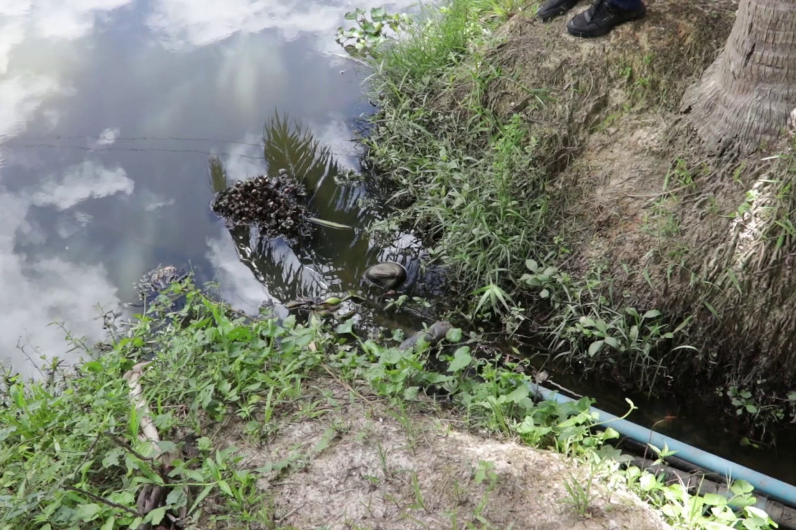 ผู้สื่อข่าว หลังจากนั้นทางเจ้าหน้าที่ได้เดินตรวจสอบตามเส้นทางของการไหลของน้ำในคลองจากที่เกิดเหตุขึ้น ประมาณเกือบ 1 กม.สภาพน้ำเหม็นเน่า มีผักตบชวาเหี่ยวเป็นสีน้ำตาลลอยตายเป็นแพ และพบว่าบริเวณท่อระบายริมถนนสายเอเชีย 41 มีน้ำสีเหลืองขุ่นไหลลงมาเป็นระยะ โดยทั้งสองฝั่งของถนนสายเอเซีย41เต็มไปด้วยล้งทุเรียนขนาดใหญ่ เป็นจำนวนมาก โดยเจ้าหน้าที่ได้เข้าไปตรวจสอบพบร่องรอยคราบสีเหลืองตามภาชนะติดให้เห็น และยังพบหญ้าที่ถูกยาชุบจากสีเขียวกลายเป็นสีเหลืองตายอีกด้วย