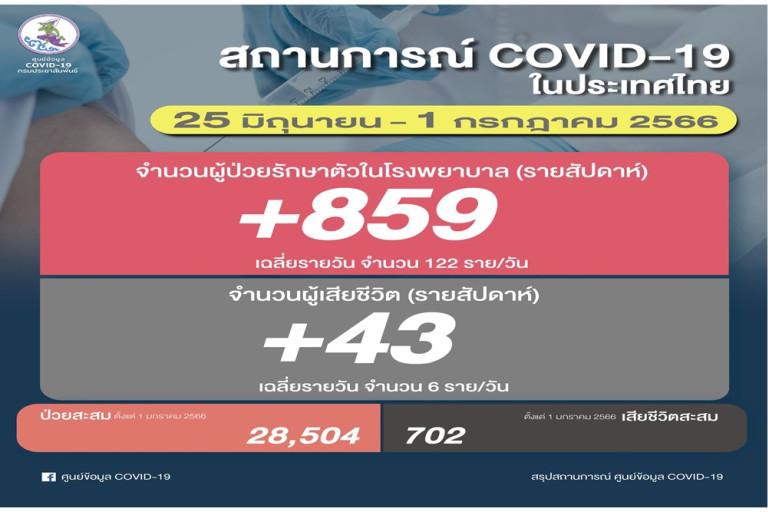 เกาะติดยอดผู้ติดเชื้อโควิด-19 รายสัปดาห์ ระหว่างวันที่ 25 มิถุนายน - 1 กรกฎาคม 2566 ผู้ป่วยรักษาตัวในโรงพยาบาล (รายสัปดาห์) จำนวน 859 ราย : เฉลี่ยรายวัน จำนวน 122 ราย/วัน ผู้เสียชีวิต (รายสัปดาห์) จำนวน 43 ราย : เฉลี่ยรายวัน จำนวน 6 ราย/วันผู้ป่วยรักษาในโรงพยาบาล สะสม 28,504 ราย (ตั้งแต่ 1 มกราคม 2566) ผู้เสียชีวิต สะสม 702 ราย (ตั้งแต่ 1 มกราคม 2566)