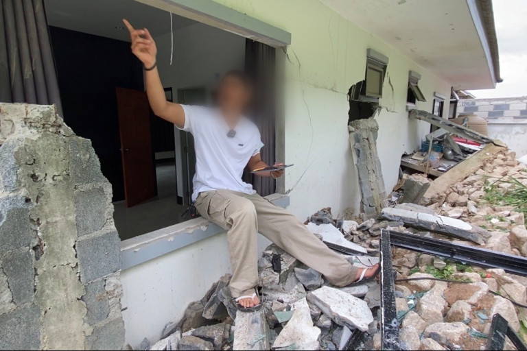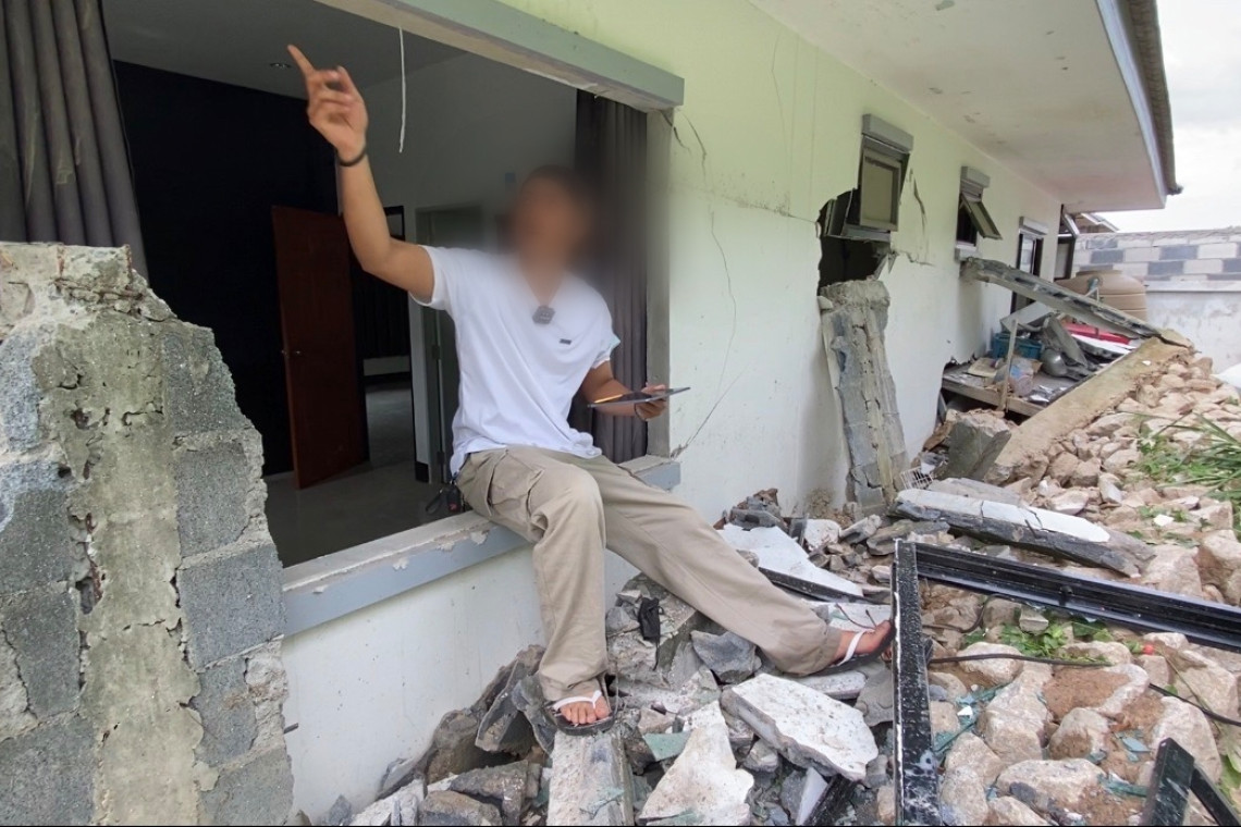 เมื่อไปถึงบ้านหลังดังกล่าวในหมู่บ้าน พบว่าเป็นหมู่บ้านอยู่ติดกันทั้งหมด 6 หลัง ขนาดพื้นที่ 65 ตรม. บ้านนายจิรศิลป์ อยู่ด้านในสุด เมื่อเดินเข้าไปถึงก็พบกับซากปรักหักพังของกำแพงที่ถล่มลงมาทั้งแผง ล้มทับผนังบ้านจนทะลุเป็นรูใหญ่ วงกบหน้าต่างกระเด็นหลุดออกมากองกับพื้น เครื่องปรับอากาศพังเสียหาย และยังมีน้ำไหลซึมออกมาจากพื้น