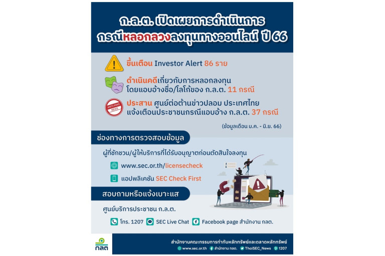 ในปี 2566 (เดือนมกราคม-มิถุนายน 2566) ก.ล.ต.ได้ดำเนินการขึ้นเตือนใน Investor Alert จำนวน 86 ราย นอกจากนี้ ก.ล.ต.ได้ดำเนินการประสานงานไปยังศูนย์ต่อต้านข่าวปลอมประเทศไทย หรือ Anti-Fake News Center Thailand เพื่อออกข่าวแจ้งเตือนประชาชน จำนวน 37 กรณี และในส่วนของการดำเนินคดีตามกฎหมายในปี 2566 ได้มีการร้องทุกข์กล่าวโทษต่อเจ้าพนักงานเกี่ยวกับการหลอกลงทุนโดยแอบอ้างตราสัญลักษณ์ของ ก.ล.ต. ไปแล้วจำนวน 11 กรณี ทั้งนี้ที่ผ่านมา ก.ล.ต. ได้มีการประชาสัมพันธ์เกี่ยวกับการหลอกลงทุน ทั้งการเผยแพร่ข่าว บทความ อินโฟกราฟิก และคลิปให้ความรู้ต่างๆมาอย่างต่อเนื่อง