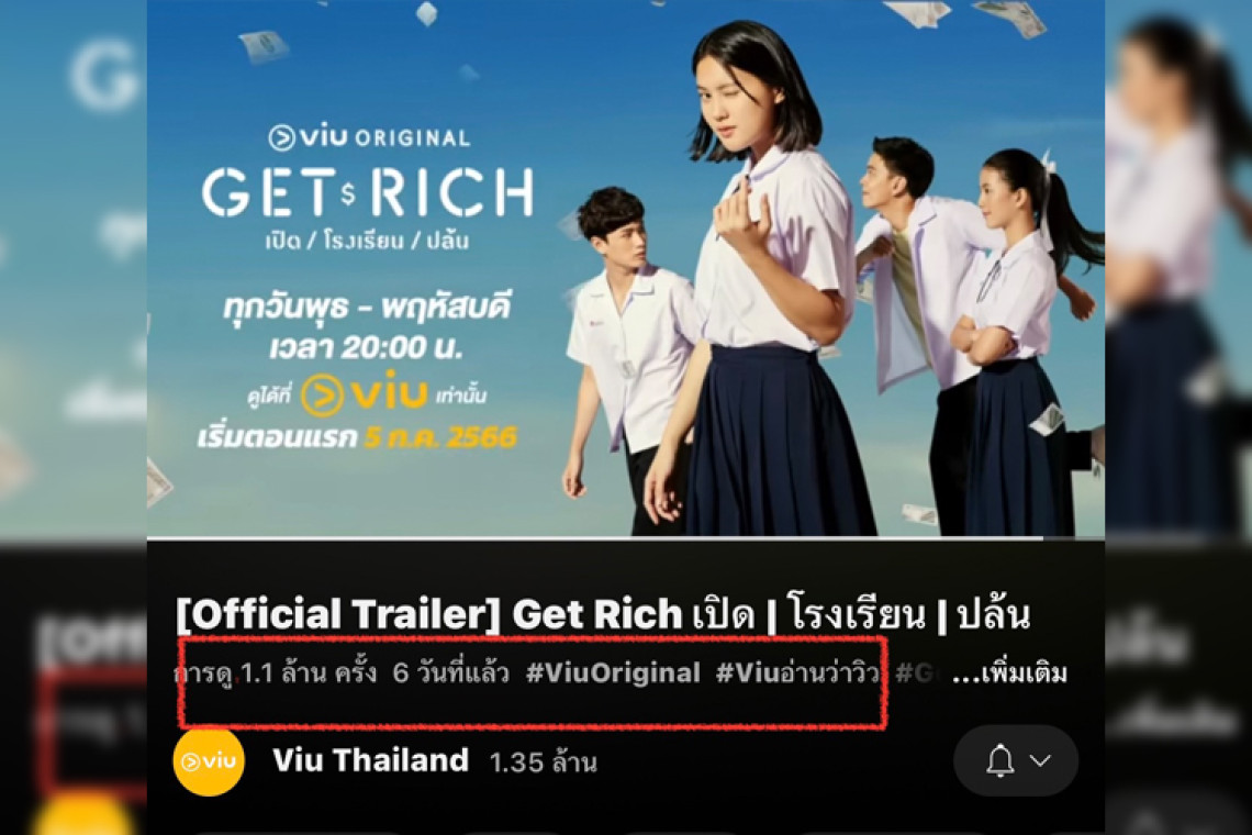 หลังจากที่ Viu Original ได้ปล่อยทีเซอร์แรก GET RICH เปิด / โรงเรียน / ปล้น ออกสู่โลกออนไลน์เพื่อเป็นน้ำจิ้มมาเรียกน้ำย่อยก็ปังทะลุโซเชียลกันไปเลยสิค่ะ สำหรับกระแสตอบรับของชาวโซเชียลที่การันตีได้จากยอดชมบนยูทูบ Viu Thailand ที่เข้ามาดูถึง 1.1 ล้านวิว https://youtu.be/YtSQYbH8JGw