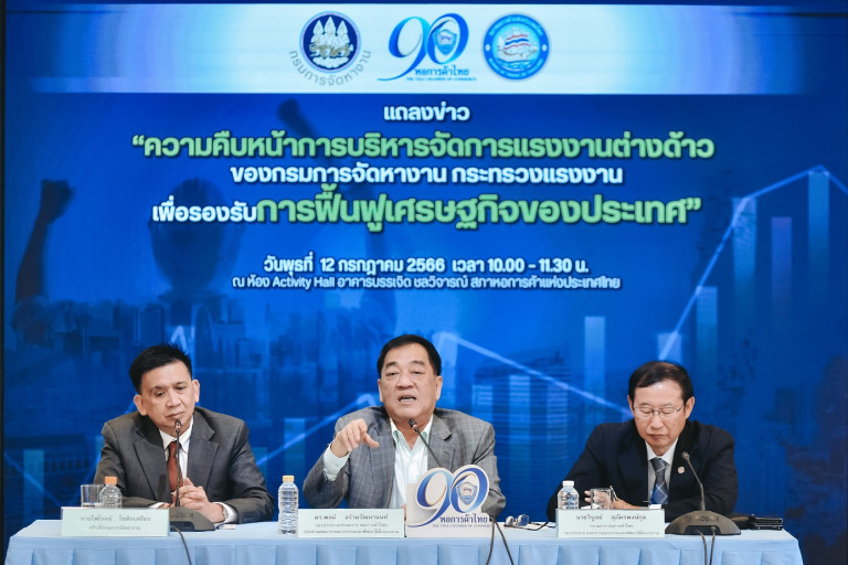 เมื่อวันที่ 12 ก.ค.66 นายไพโรจน์ โชติกเสถียร อธิบดีกรมการจัดหางาน แถลงข่าวความคืบหน้าการบริหารจัดการแรงงานต่างด้าวของกรมการจัดหางาน กระทรวงแรงงาน เพื่อรองรับการฟื้นฟูเศรษฐกิจของประเทศ ณ ห้อง activity Hall อาคารบรรเจิด ชลวิจารณ์ หอการค้าไทย ถนนราชบพิธ ร่วมกับ ดร.พจน์ อร่ามวัฒนานนท์ รองประธานกรรมการหอการค้าไทย และประธานคณะกรรมการแรงงานและพัฒนาฝีมือแรงงาน และนายวิบูลย์ สุภัครพงษ์กุล กรรมการหอการค้าไทย และรองประธานคณะกรรมการแรงงานและพัฒนาฝีมือแรงงาน