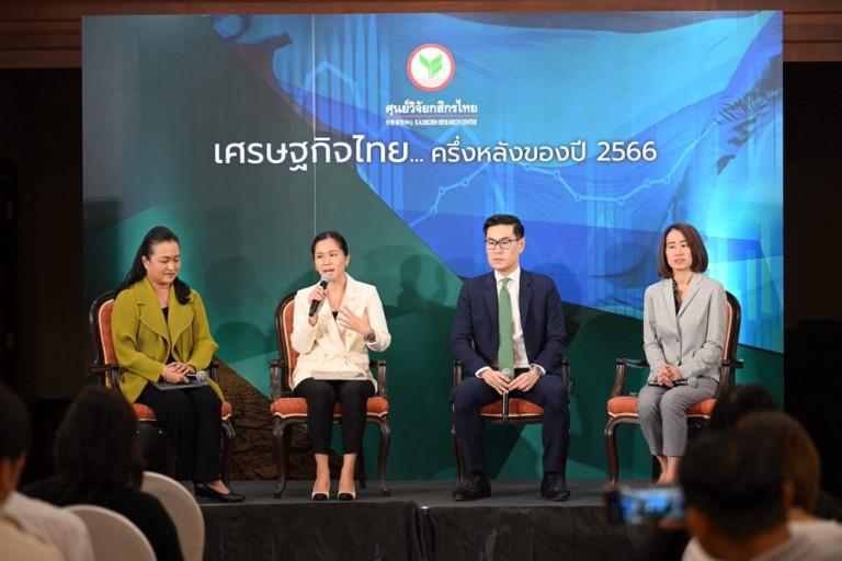 นางสาวณัฐพร ตรีรัตน์ศิริกุล รองกรรมการผู้จัดการ บริษัท ศูนย์วิจัยกสิกรไทย จำกัด กล่าวว่า แม้เศรษฐกิจในช่วงครึ่งปีหลัง จะเห็นภาพการขยายตัวที่ดีกว่าครึ่งปีแรก โดยได้รับแรงหนุนจากฤดูกาลท่องเที่ยวที่สุดท้ายแล้ว คงจะเห็นตัวเลขนักท่องเที่ยวต่างชาติทั้งปี 2566 ที่ประมาณ 28.5 ล้านคน และทำให้คาดว่าจีดีพีในช่วงครึ่งปีหลังจะขยายตัวประมาณ 4.3% จากช่วงครึ่งปีแรกที่ประมาณ 3.0% อย่างไรก็ตามไทยจะเผชิญหลายโจทย์สำคัญที่ท้าทายการฟื้นตัวทางเศรษฐกิจในช่วงครึ่งปีหลัง โดยโจทย์แรก คือ การจัดตั้งรัฐบาล และการรับมือกับทิศทางเศรษฐกิจจีนที่เริ่มเห็นสัญญาณอ่อนแรง ซึ่งย่อมเปิดประเด็นความเสี่ยงให้กับเศรษฐกิจอาเซียนและไทยที่พึ่งพาเศรษฐกิจจีนค่อนข้างสูง โดยศูนย์วิจัยกสิกรไทยยังคงประมาณการจีดีพีปี 2566 ที่ 3.7% และคงตัวเลขการส่งออกไว้ที่ -1.2% แต่ปรับลดการบริโภคภาครัฐบาลและการลงทุน เนื่องจากยังอยู่ในช่วงที่รอการจัดตั้งรัฐบาลใหม่ และปัญหาหนี้ครัวเรือนที่มีความซับซ้อนซึ่งเป็นโจทย์ที่รอการแก้ไข