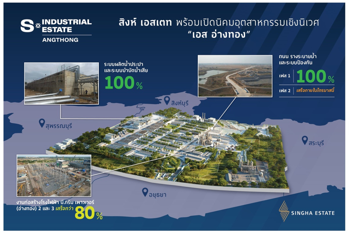 นิคมเอส อ่างทอง โดยสิงห์ เอสเตท เตรียมเปิดตัวเต็มรูปแบบปลายไตรมาส 3 ปีนี้ ตอกย้ำการเป็นนิคมอุตสาหกรรมเชิงนิเวศ Eco Factory & Green industry บนพื้นที่ยุทธศาสตร์จังหวัดอ่างทอง ล่าสุดการก่อสร้างภาพรวมคืบหน้าไปแล้วกว่า 90% พร้อมเปิดสำนักงาน กนอ. แบบ One stop service ภายในพื้นที่นิคมฯ รองรับการประกอบกิจการด้านนิคมอุตสาหกรรมครบวงจร ขณะที่โรงไฟฟ้าอีก 2 แห่ง กำหนดเสร็จพร้อมจำหน่ายกระแสไฟฟ้าเชิงพาณิชย์ช่วงเดือนกันยายน – ตุลาคม โดยสามารถรับรู้รายได้ทันที พร้อมมอบสิทธิประโยชน์พิเศษสำหรับกลุ่มลูกค้า SME