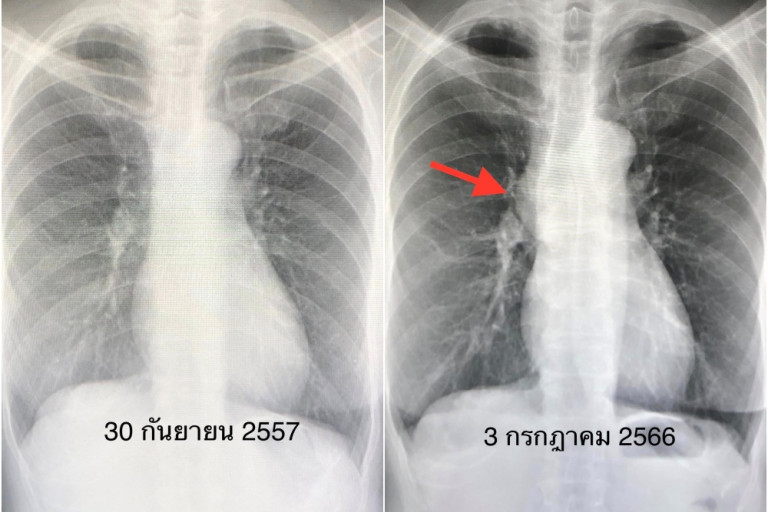 ผู้ป่วยหญิงอายุ 66 ปี ปกติแข็งแรงดี มาตรวจสุขภาพ ทำเอกซเรย์ปอดพบก้อนที่ด้านขวาในช่องกลางของทรวงอก (ดูรูป) ไม่ไอ ไม่เหนื่อย ไม่เบื่ออาหาร น้ำหนักไม่ลด ไม่เจ็บหน้าอก เคยทำเอกซเรย์ปอดครั้งสุดท้ายเมื่อ 9 ปีที่แล้วปกติ (ดูรูป)